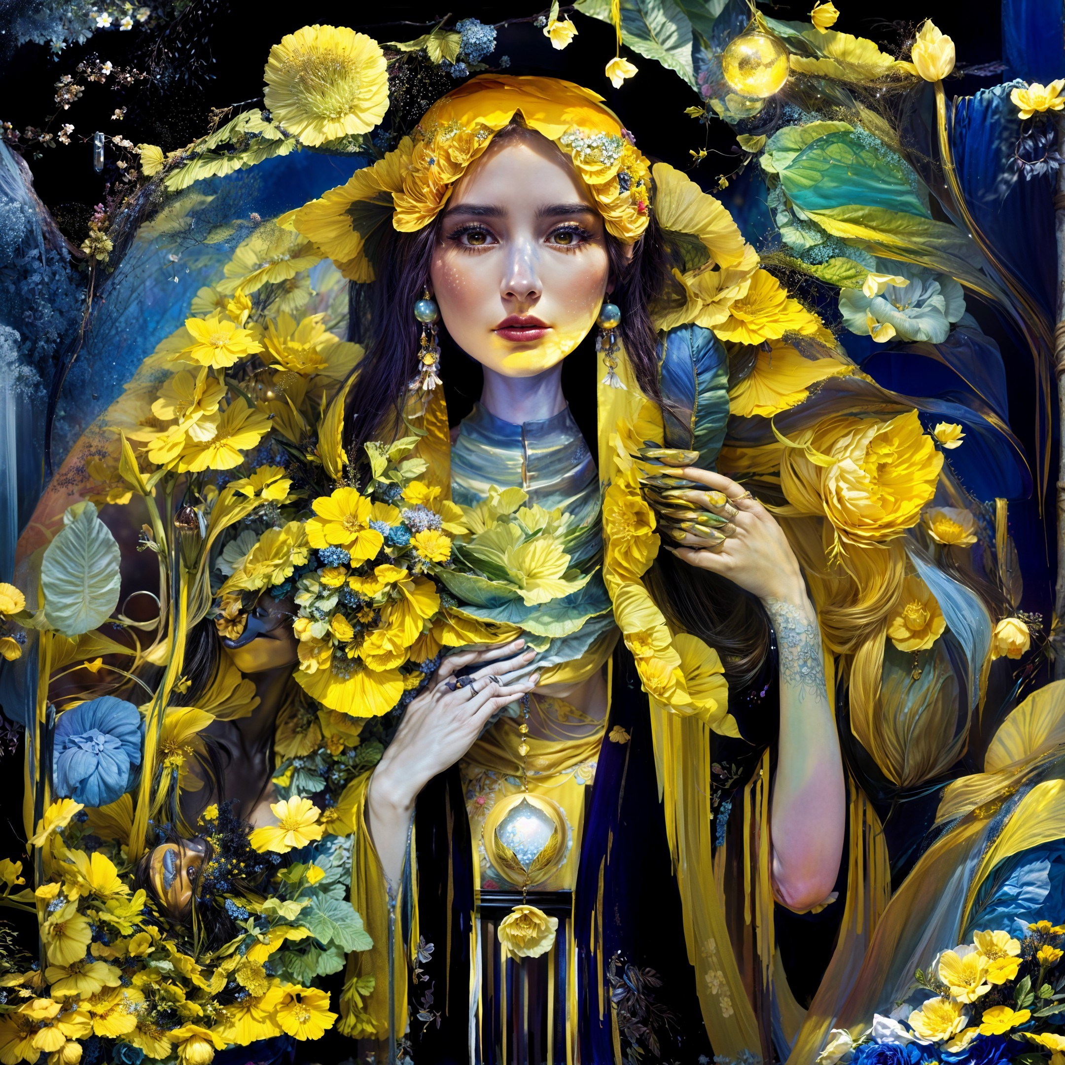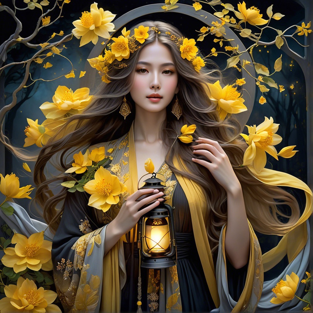 A serene figure adorned in a flowing robe, surrounded by vibrant yellow flowers. She holds a lantern, with long, flowing hair and a tranquil expression, embodying grace and nature's beauty.
