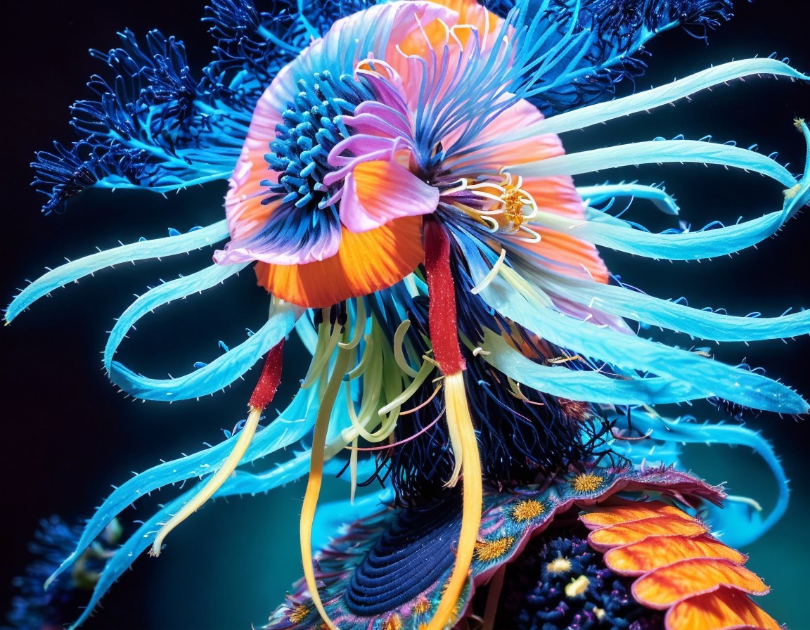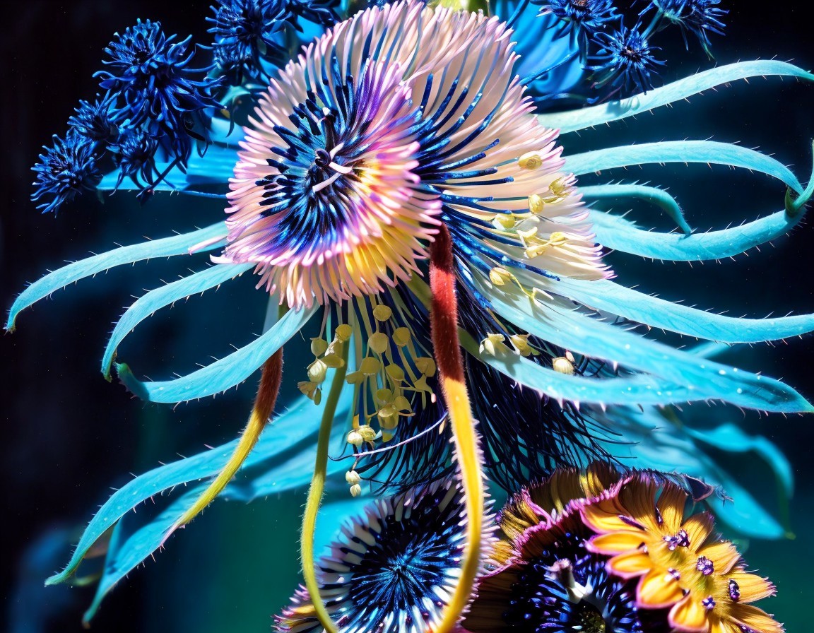 + Prompt:Close-up of a Passiflora caerulea (blue passionflower) prominently displayed against a subtle, soft-focus background. The flower exhibits a radial symmetry with five pale green, ovate sepals and five white petals with a delicate, creamy tone both featuring finely serrated edges. At the center, a prominent ring of filamentous, radiating purple-and-white banded coronal filaments encircle a central, dark purple and white ring. The corona is topped by an intricate structure consisting of three prominent, bi-lobed, dark green stigmas elevated above a whorl of five bright yellow, sickle-shaped anthers, all supported by a slender, pale green style and androgynophore. The distinctive, coiled floral tendrils are greenish-black, adding to the unusual and striking appearance of the bloom, which is situated atop a cylindrical greenish glass bottle with embossed details, capturing the natural translucency and reflective qualities of the glass.