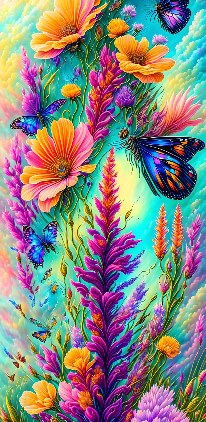 Wild flowers, surreal sky, fluffy beautiful clouds, beautiful butterflies and dragonflies in harmony creating a breathtaking landscape view. pinstriping art deco, opalescent colors, bright and bold but in harmony with nature, Josephine Wall ultra detailed, Catherine Able, Salvador Dali, Gypsy winds