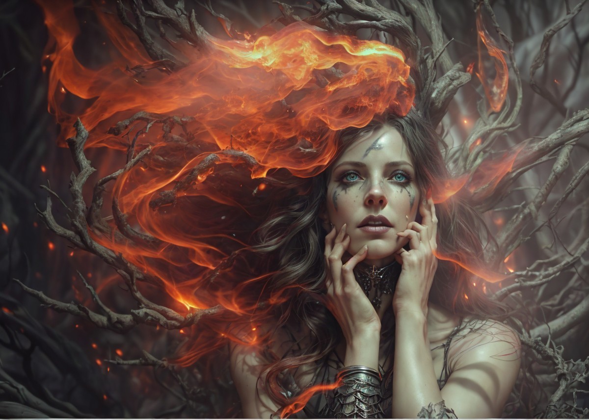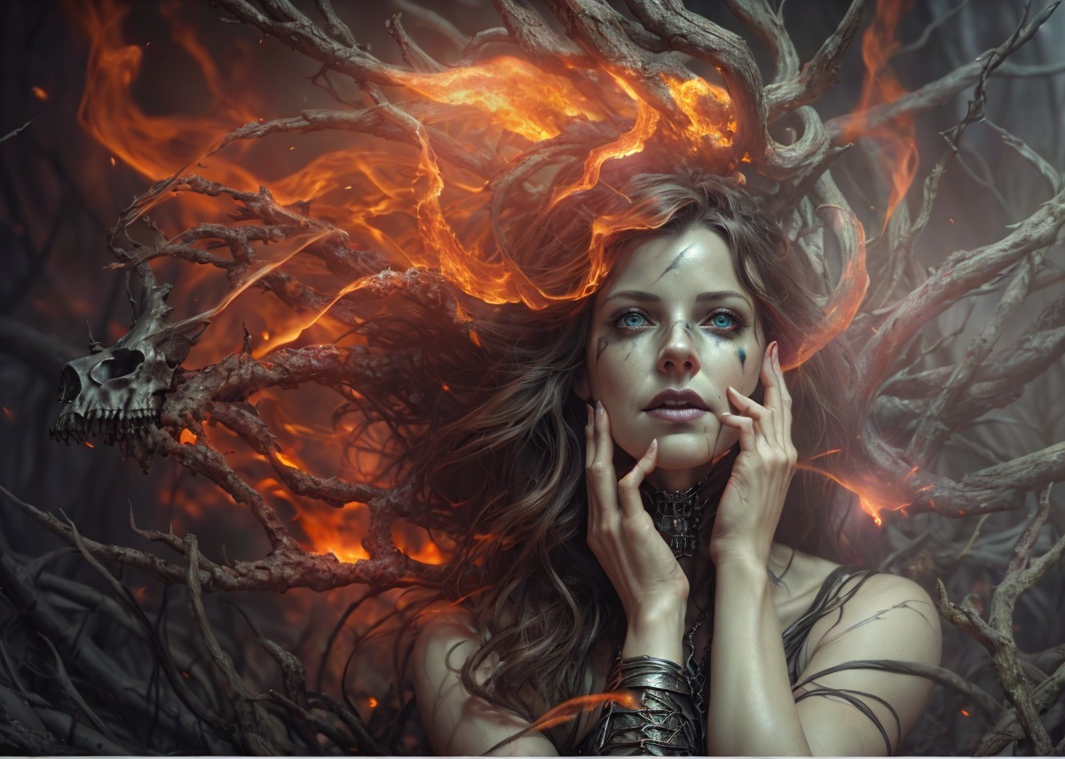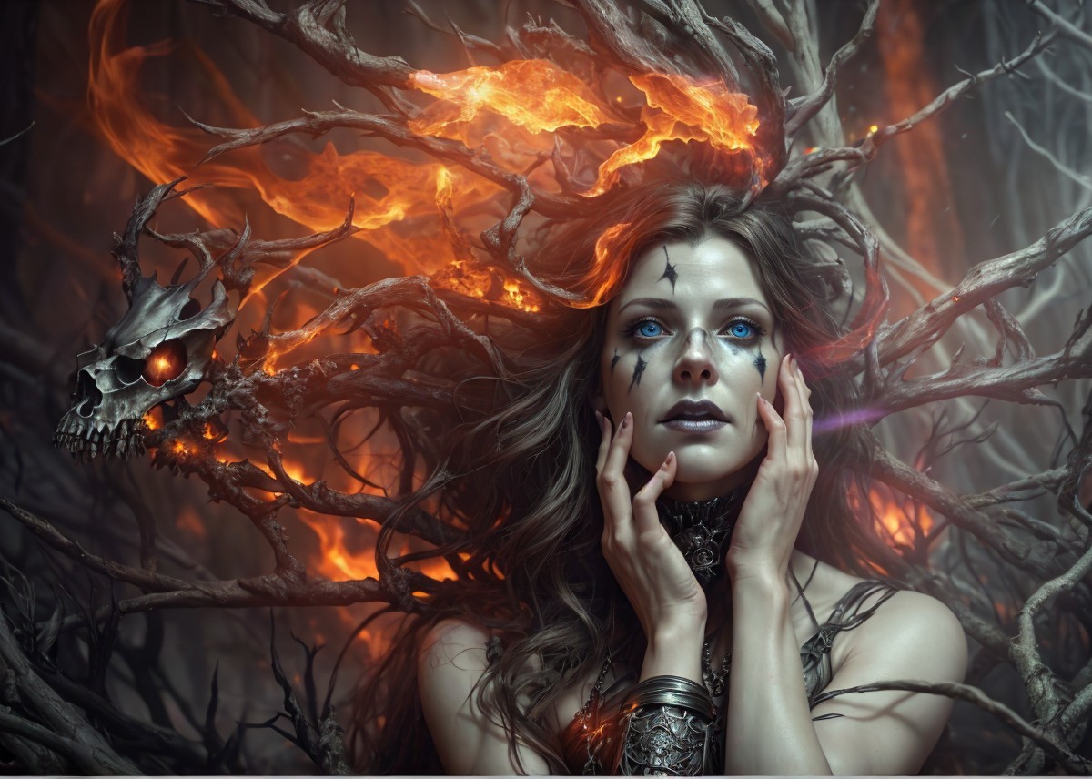 Prompt: "(art by cameron gray epic poster), ((((Hyper realistic underworld witch, (((hyper realistic perfect eyes))), extremely detailed Award winning photography studio lighting 8k cinematic lighting photorealistic wallpaper hyperrealistic Unreal Engine cinematic postprocessing Ultra realistic 3D Cinematic Lighting scary dark creatures sit on a pile of bones, fire, sparks and mist, with a dark forest in the background)))),watercolour painting, Jean-Baptiste Monge style rim lighting, lights, magic, fantasy, digital art, wlop, artgerm and james jean)"