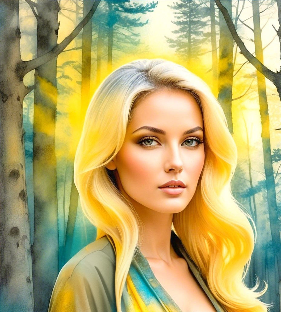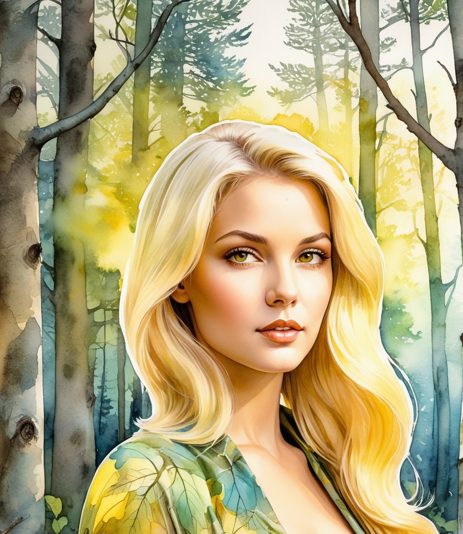 Temptress with yellow translucent light aura in front of forestal background, watercolor and ink extrusion, hues of aquarelle, stylized trees with leaves and branches, trans-Avantgarde merged with foampunk, juvenile woman with blonde tessellated hair, forestal background with pointillism details: foliage carpeting the soil, simplistic trees, tints of comic book art, reminiscent of autumn academia, delicate tones of soft yellow and pale auburn, divisionism, sculpted, dark fantasy, soft diffused lighting, magical, mystical, Opalescent, luminous, mood, allure, Casual line and wash sketch, nuanced, otherworldly, foampunk, uhd,hdr, octane render illustration 1.5, comic book art 1.7, stippled, coherent, stacked-up perspective, charcoal textures 1.7, quaint, blotting paint, push processing technique, xeroxed, cel-shaded, sculpted, baroque, lineage derails and contouring outlines with thick strokes, softened edges, divisionism, rule of thirds, chiaroscuro lighting, 3d effects, parallax occlusion 1.2, raytraced shadows 1.8, psychedelic psychpomp scene, victorian decay, anglo gothic 1.7, dimmed dynamic lighting, stylized lineage illustration 1.5, exaggerated forestcore 1.5