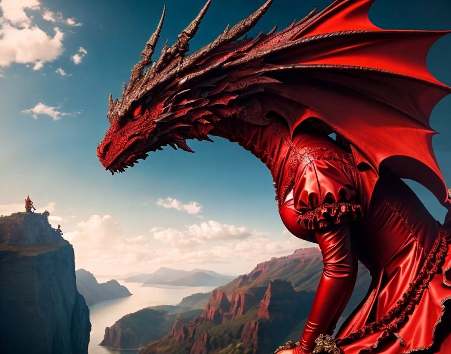 A majestic red dragon perches on a cliff overlooking a scenic canyon with a river, under a sunset sky.