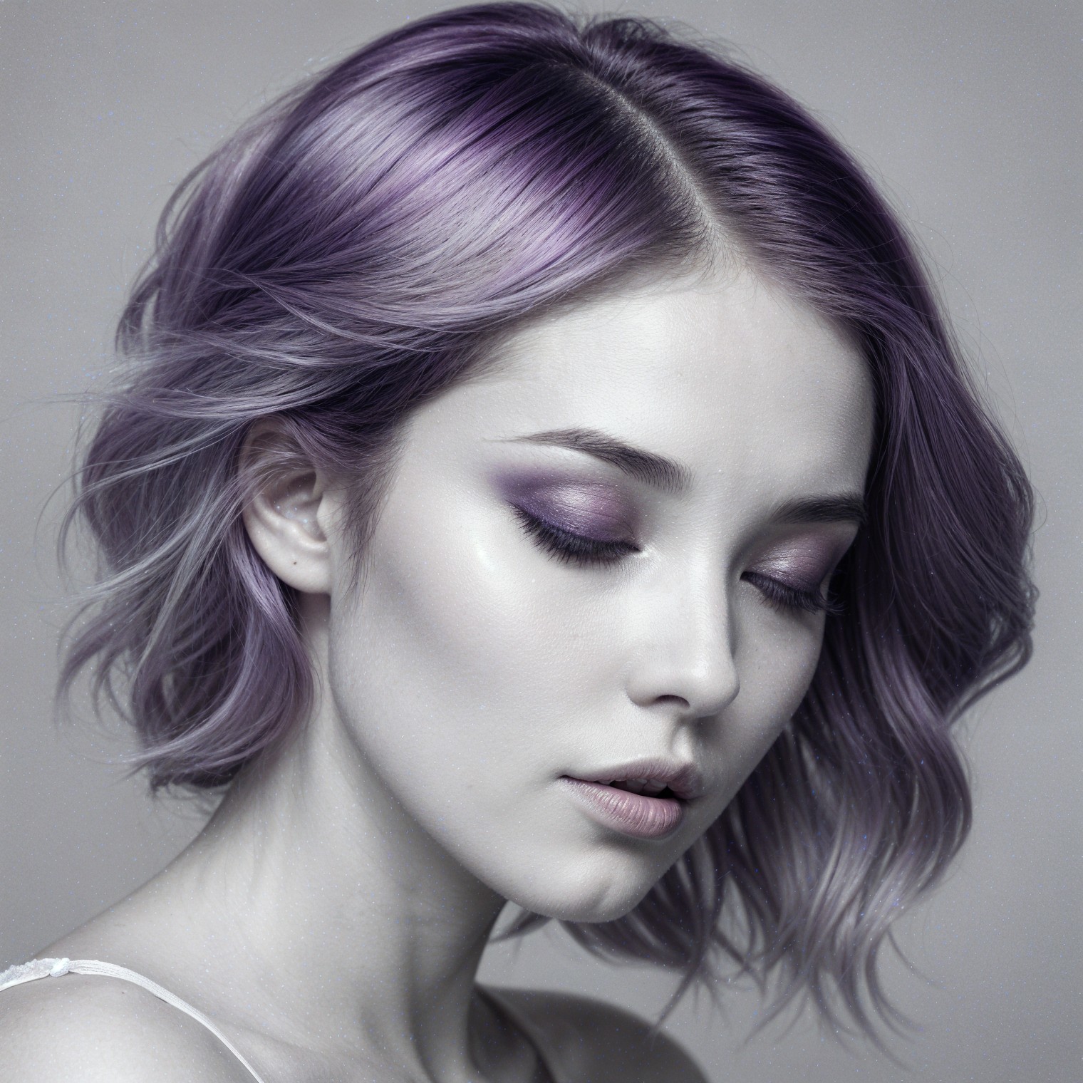 A close-up portrait of a young person with wavy, shoulder-length lavender hair and soft, ethereal makeup. Their pale skin and striking eyes create a captivating and dreamlike appearance.