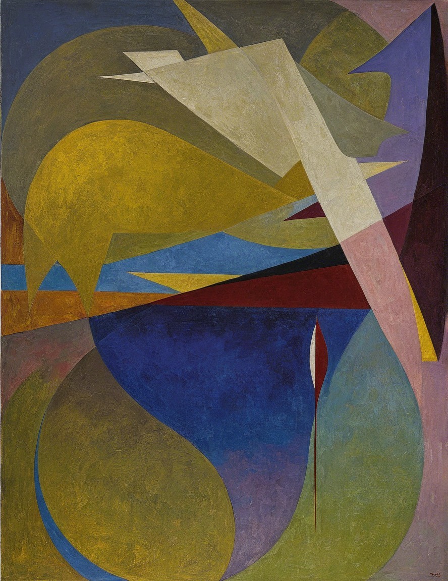 This abstract painting features bold colors and dynamic shapes, including sweeping curves, geometric forms, and star-like elements, creating a vibrant and energetic composition.