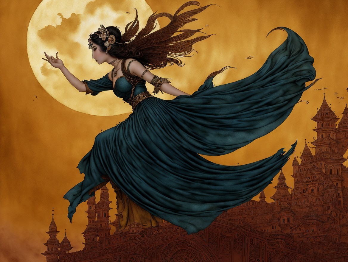 Ancient cities, ancient tales. Ancient spirits Beautiful exotic woman. in the style of Ohara Koson. Golden Ratio, Surreal Fantasy, Elegant, High Definition Ultra Fine 3D Line, Zenangle Style, Watercolor Patchwork , Arthur Rackham Style, Paul Kidby, Gediminas Prankevicius, Jacek Jerka, Extremely Detailed, Intricate, Thoughtful, HDR, Fractal, Beautiful, Award Winning, Fantasy Look, Fantasy, Crisp Quality