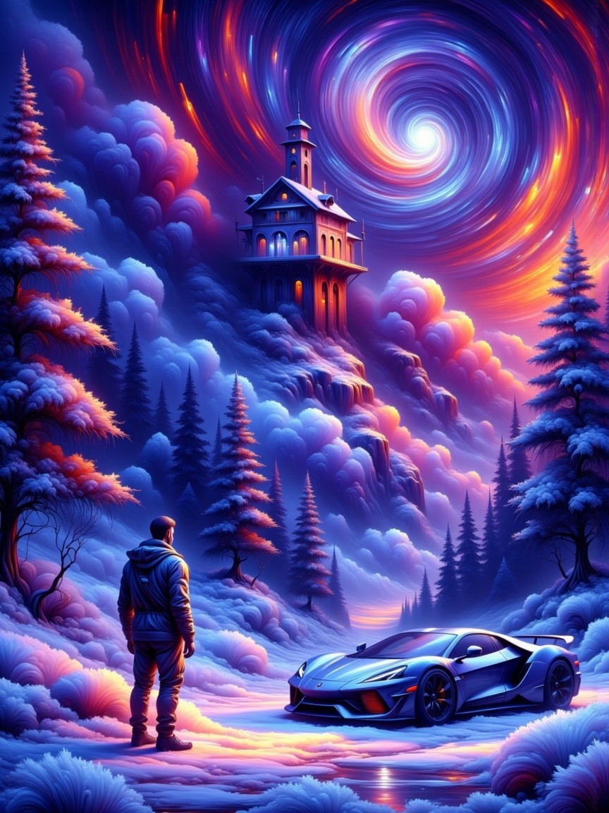 A full shot of an illustration features a vibrant mountain landscape with a young man wearing a dark jacket, dark pants, and black shoes, standing with his back to the viewer, looking at a blue sports car parked on a reflective surface that transitions into a small, reflective body of water in the foreground,