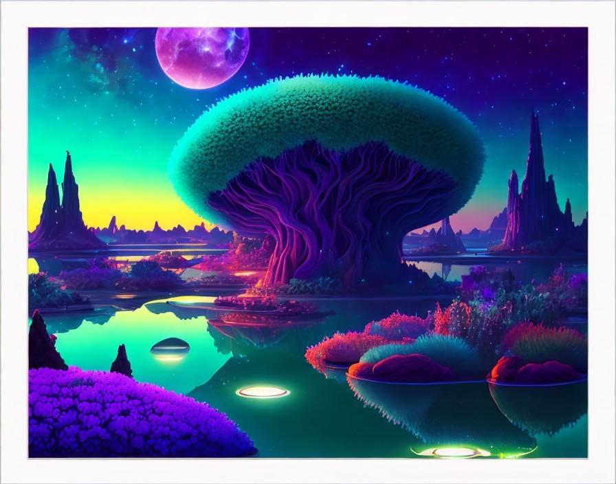 Fantasy landscape at night: giant tree, illuminated flora, reflective water, floating stones, large moon