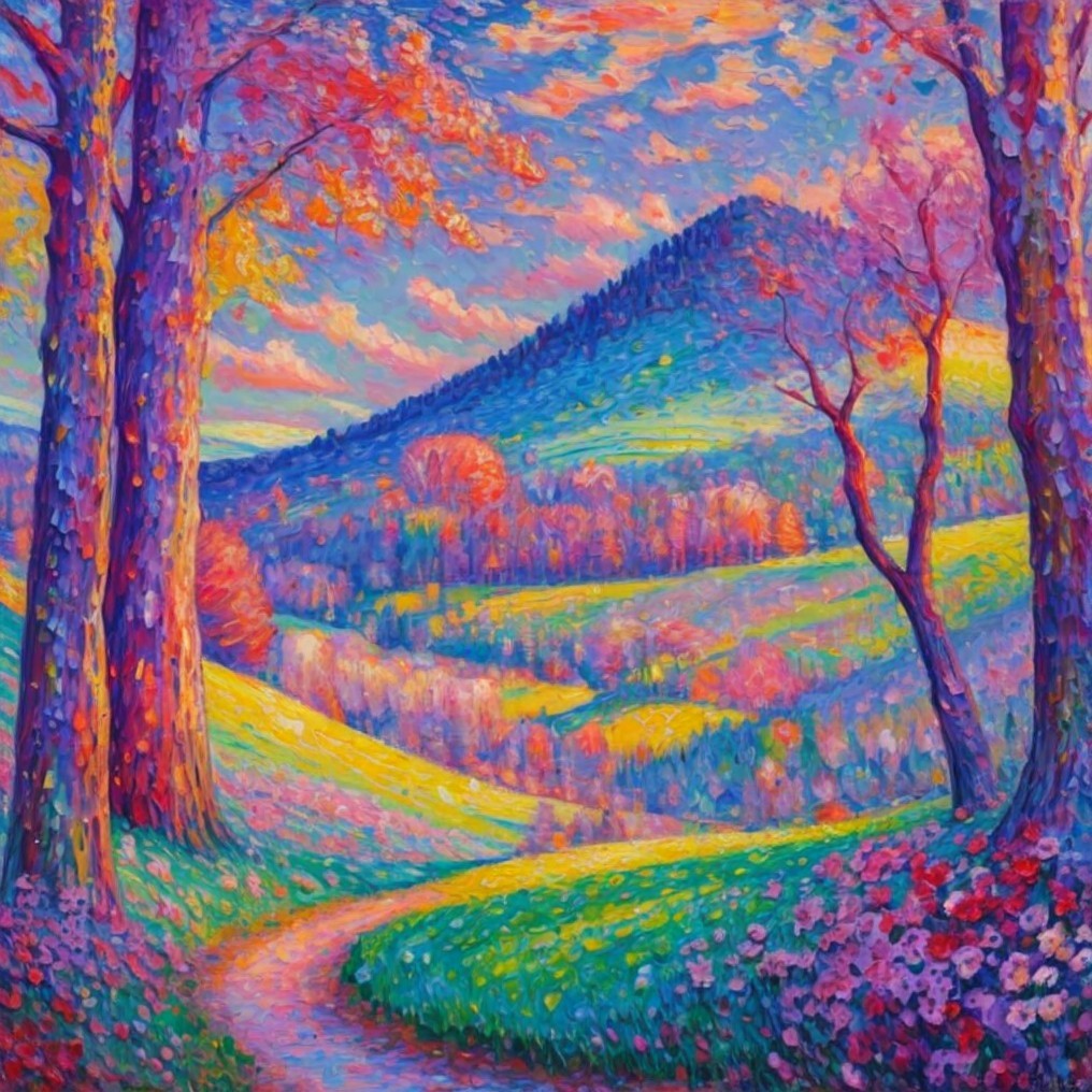A vibrant landscape filled with colorful trees and rolling hills. The scene features a winding path under a bright sky, showcasing a beautiful blend of autumn hues and lively brushstrokes.