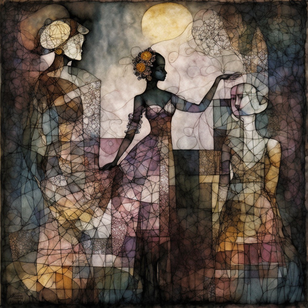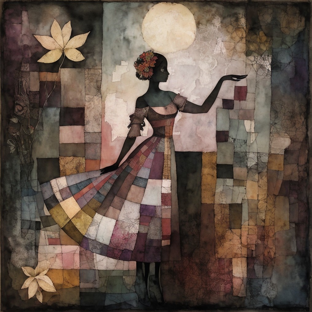 A graceful silhouette of a woman in a patterned dress stands against a background of geometric shapes and muted colors, with a large, luminous moon adding a touch of ethereal light.