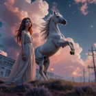 A mystical scene unfolds at sunset, featuring a woman in a flowing gown beside a rearing white horse. They stand against a backdrop of dramatic clouds and distant ruins, evoking enchantment.