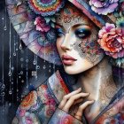 A vibrant portrait of a woman adorned with colorful makeup and a floral hat, featuring bright patterns and water droplets, exuding a whimsical, artistic vibe and bold beauty.