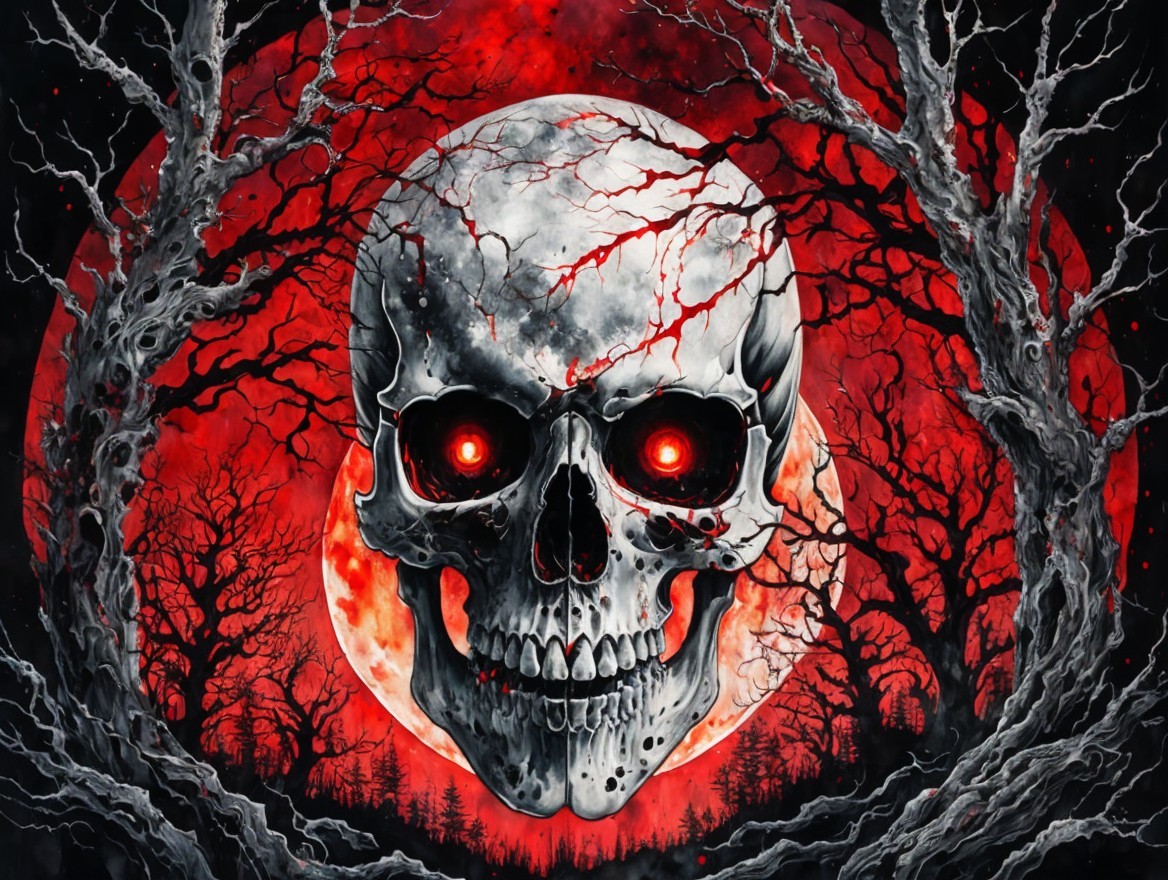 A dramatic illustration features a menacing skull with glowing red eyes, set against a vibrant red moon. Gnarled trees frame the scene, enhancing its eerie, atmospheric vibe.