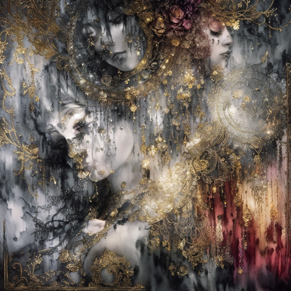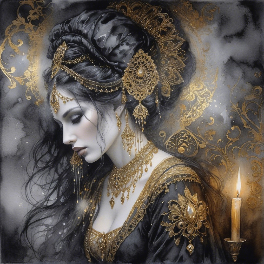 A graceful woman in elegant attire adorned with intricate gold jewelry. Her long, dark hair cascades beside her, illuminated by the warm glow of a nearby candle, creating a mysterious atmosphere.