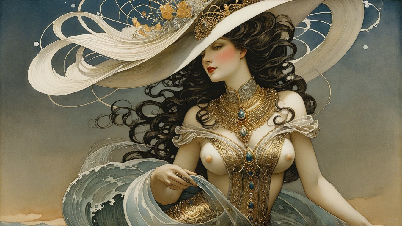 The image features a serene woman with flowing black hair, adorned in a shimmering gown and jeweled crown. Waves swirl around her, creating a captivating, mystical atmosphere.