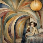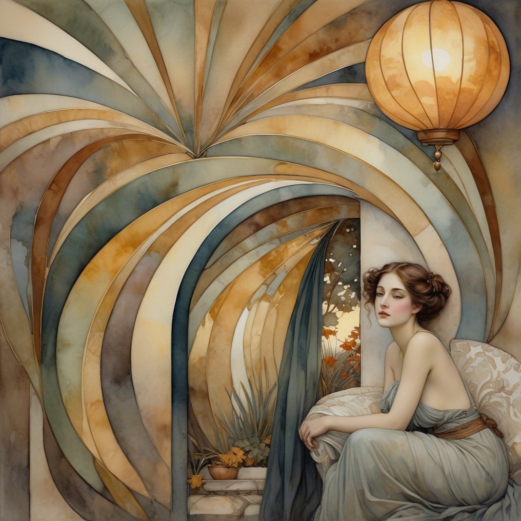 A serene young woman sits gracefully amidst autumn leaves, draped in an elegant, patterned cloak. Soft lighting highlights her thoughtful expression, accompanied by a glowing lantern nearby.