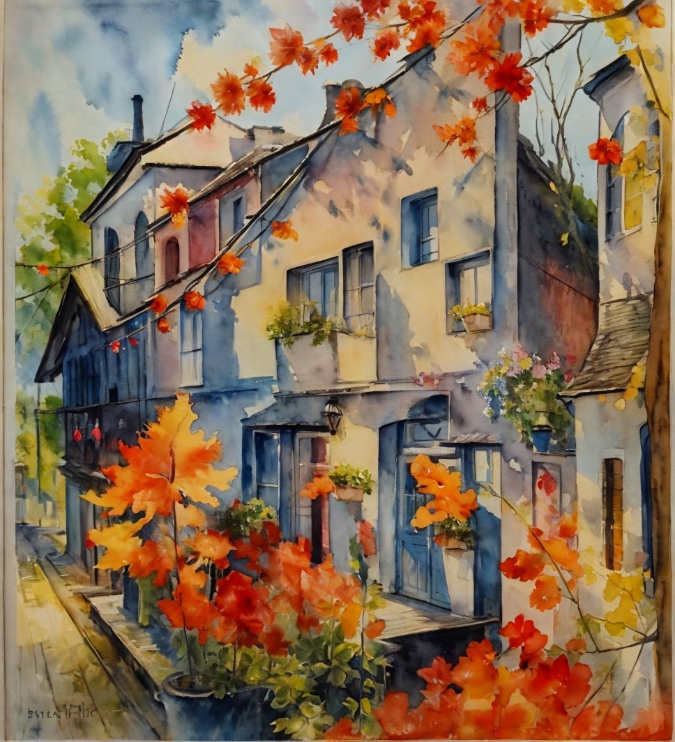 Colorful Watercolor Painting of Quaint Street with Charming Houses
