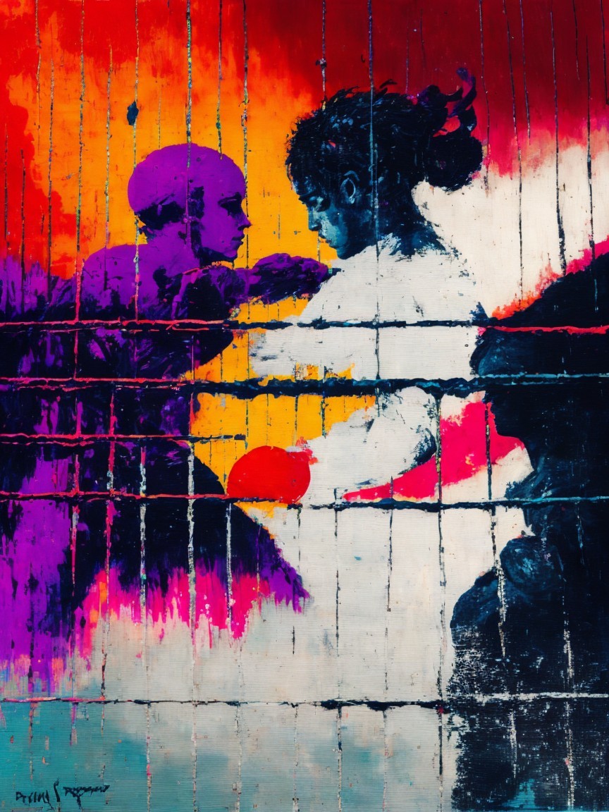 The image features a vibrant, abstract scene with bold colors depicting two figures interacting through a fence. One figure is more stylized, while the other appears more realistic, each conveying emotion.