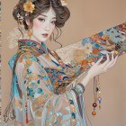 The image features a young woman in a beautifully detailed traditional outfit adorned with colorful patterns. She holds a decorative fan, blending modern and ancient artistic elements.