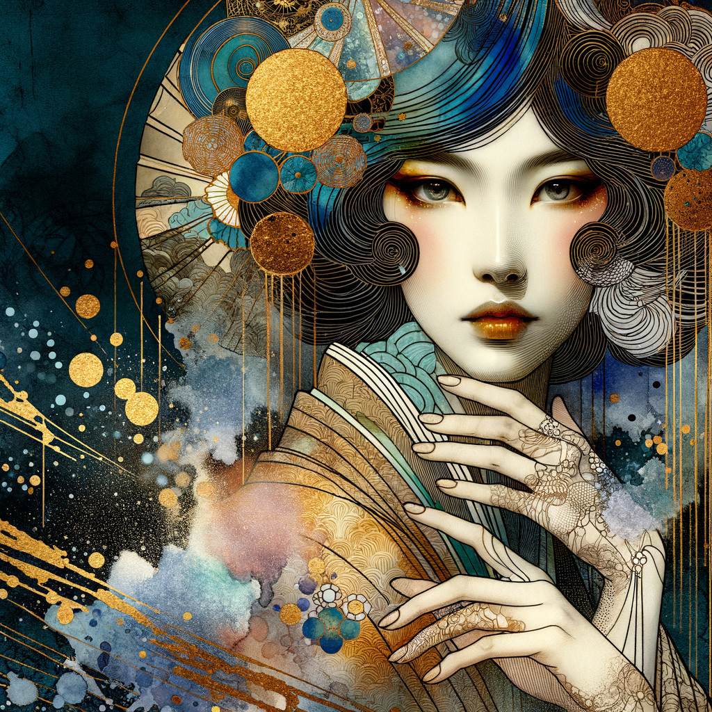 Prompt: "Double exposure effect,in silk iridescent texture, Klimt paint beautiful Japanese woman, in watercolor and ink imperial colors whit gold foil detail, Art Deco by Enki Bilai, Annigoni, Egon Schiele, Milo Manara, Botticelli, Catrin Welz-Stein, Jean Metzinger, Klimt, perfect eyes, perfect handsface, highly detailed, splatter, dynamic pose, dark blue background"