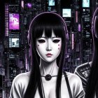 A sprawling industrial complex looms in a foggy landscape, featuring towering structures with intricate details, glowing lights, and silhouettes of workers amidst an atmosphere of advanced technology.