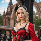 A glamorous woman in a striking red corset and black steampunk accessories stands beside a vintage airship, exuding confidence with her dramatic makeup and elaborate hat.