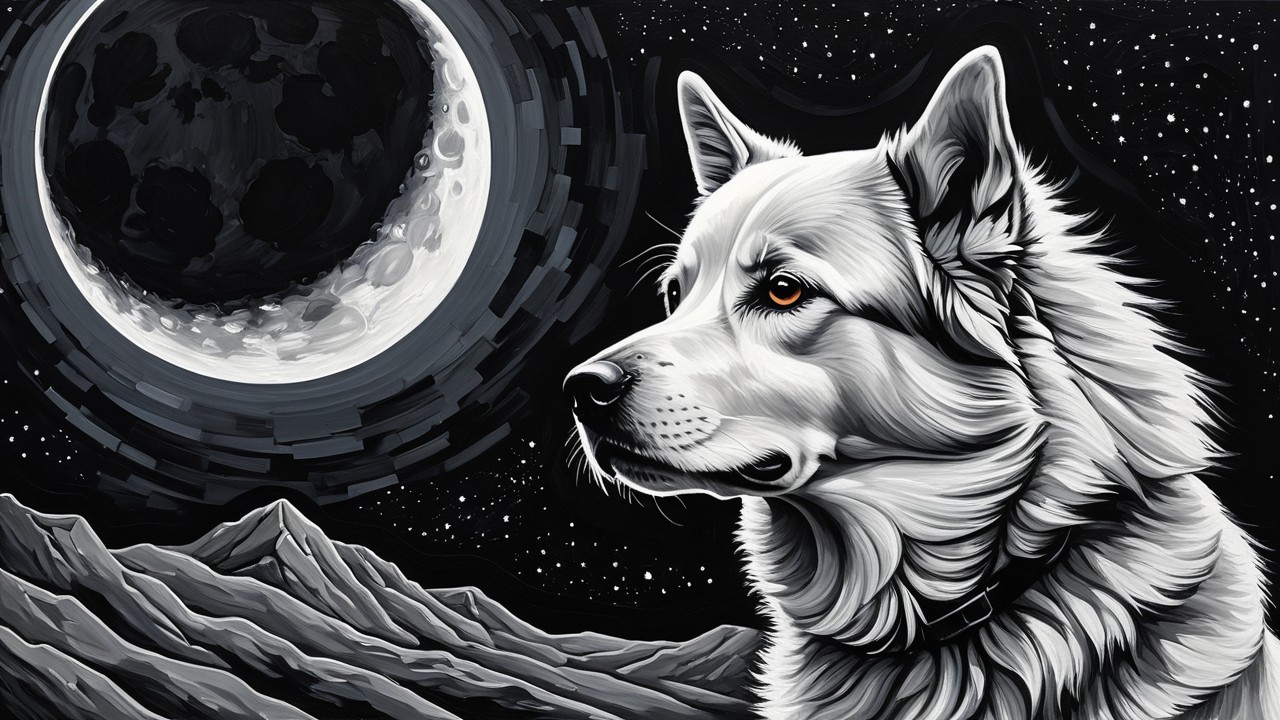 (Try from Ringworm Joey) - A striking black and white artwork featuring a wolf-like dog gazing thoughtfully at a crescent moon, set against a starry night sky and distant mountains.