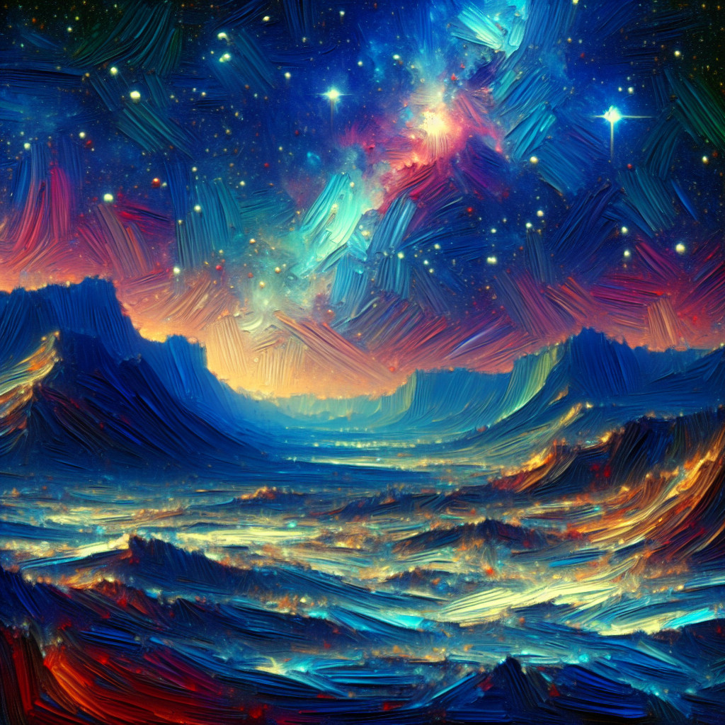 A breathtaking cosmic scene with a starry night sky, swirling galaxies, and vibrant colors illuminating the dark clouds. Below, winding roads meander through a rugged, otherworldly landscape.