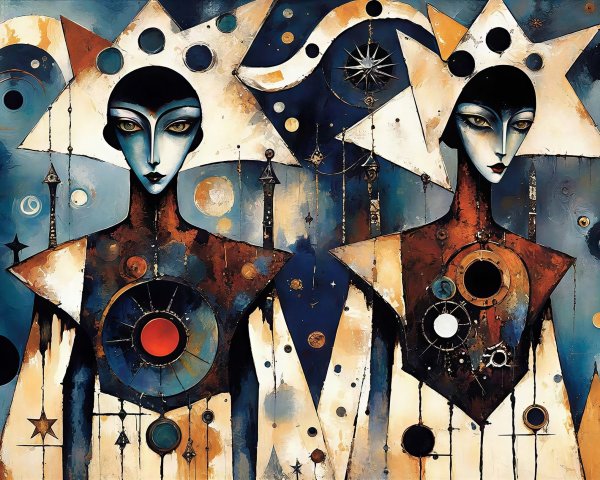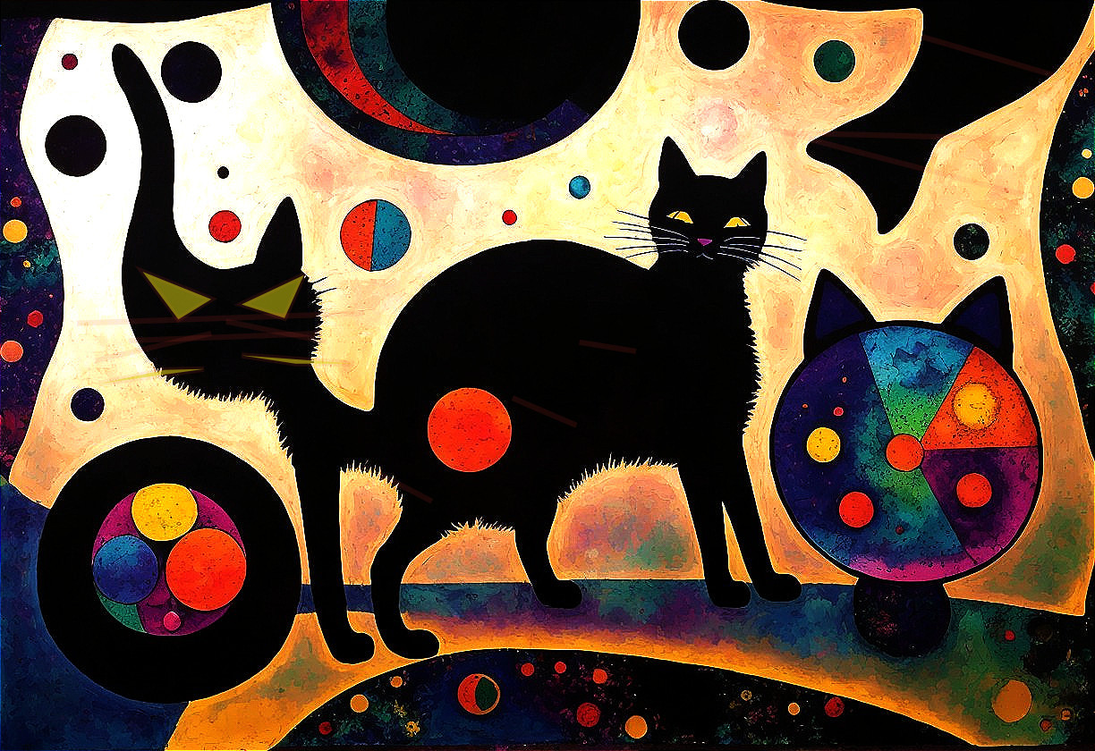 The image features two black cats against a vibrant, cosmic background filled with abstract shapes and bright colors, including circles and swirls, creating a whimsical, stellar atmosphere.