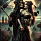 A dark fantasy scene featuring a warrior with a skull mask and a gothic woman in an elaborate dress. They stand together against a dramatic landscape with a castle and roses.