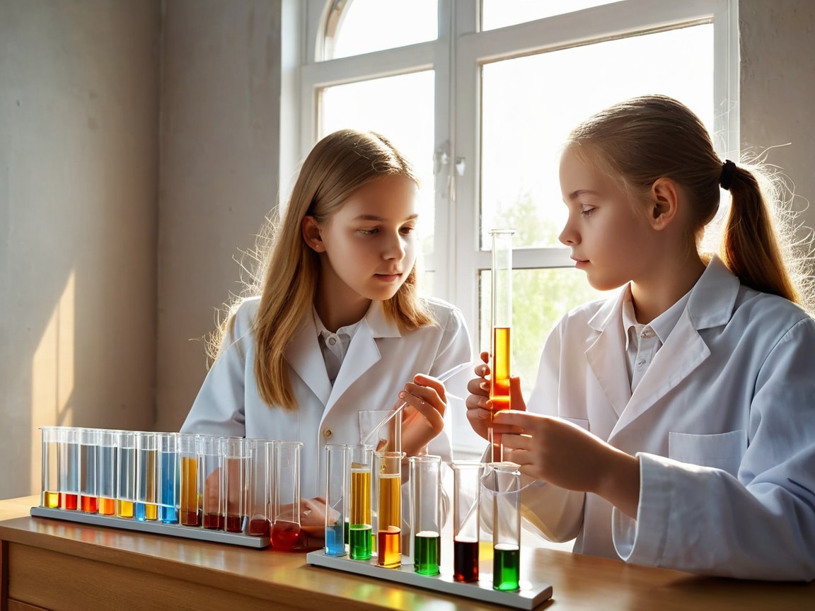 Two girls in lab coats are engaged in a science experiment, carefully pouring colorful liquids into test tubes. The sunlight streams through a window, illuminating their focused expressions.