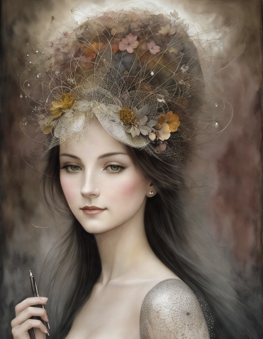 An illustration of a woman with an ornate headdress resembling the moon and foliage, against a celestial backdrop.