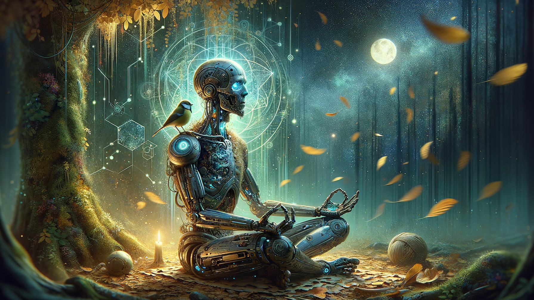 In a mystical forest, a robotic figure meditates peacefully, adorned with intricate circuitry. A small bird perches on its shoulder, as glowing symbols and falling leaves create an enchanting atmosphere.