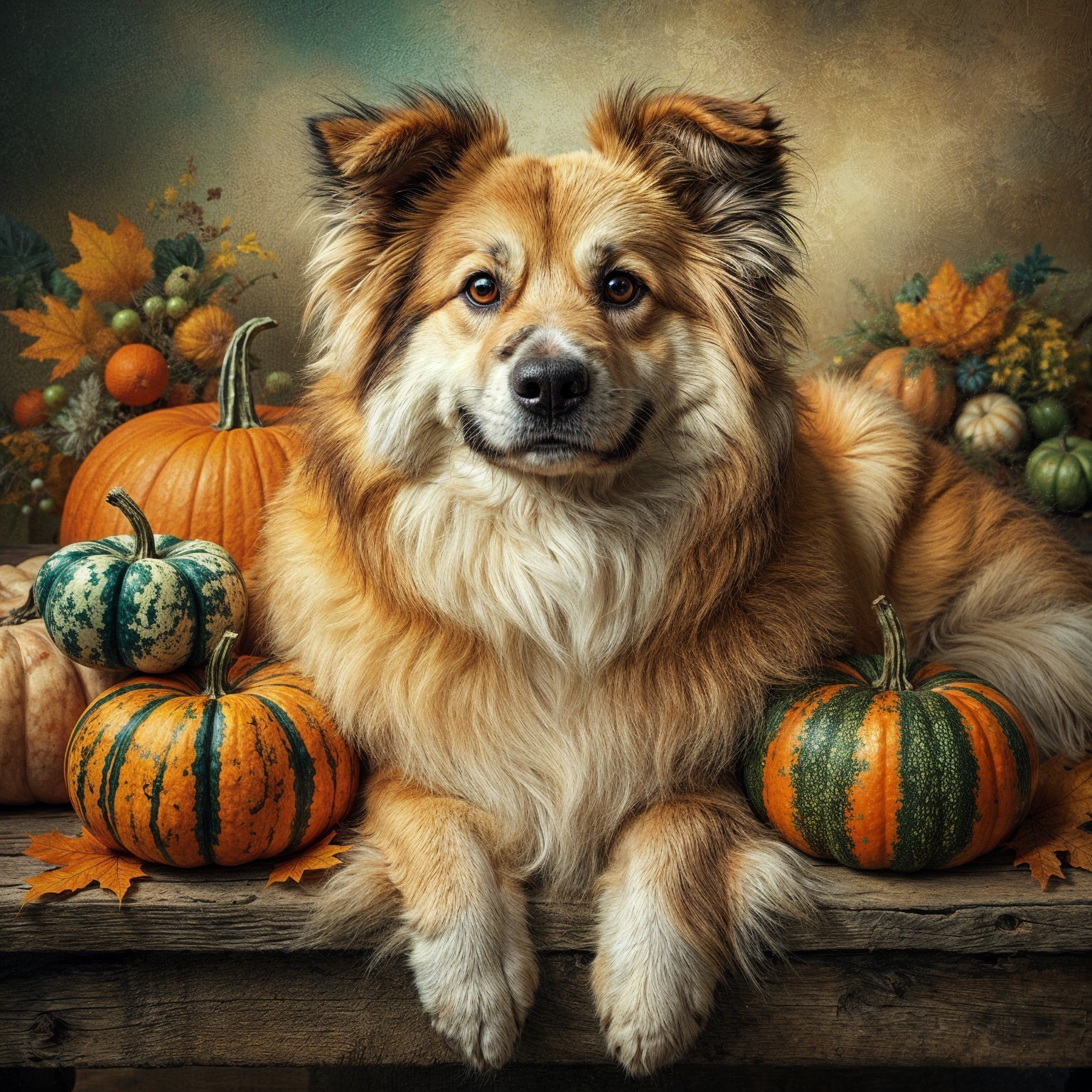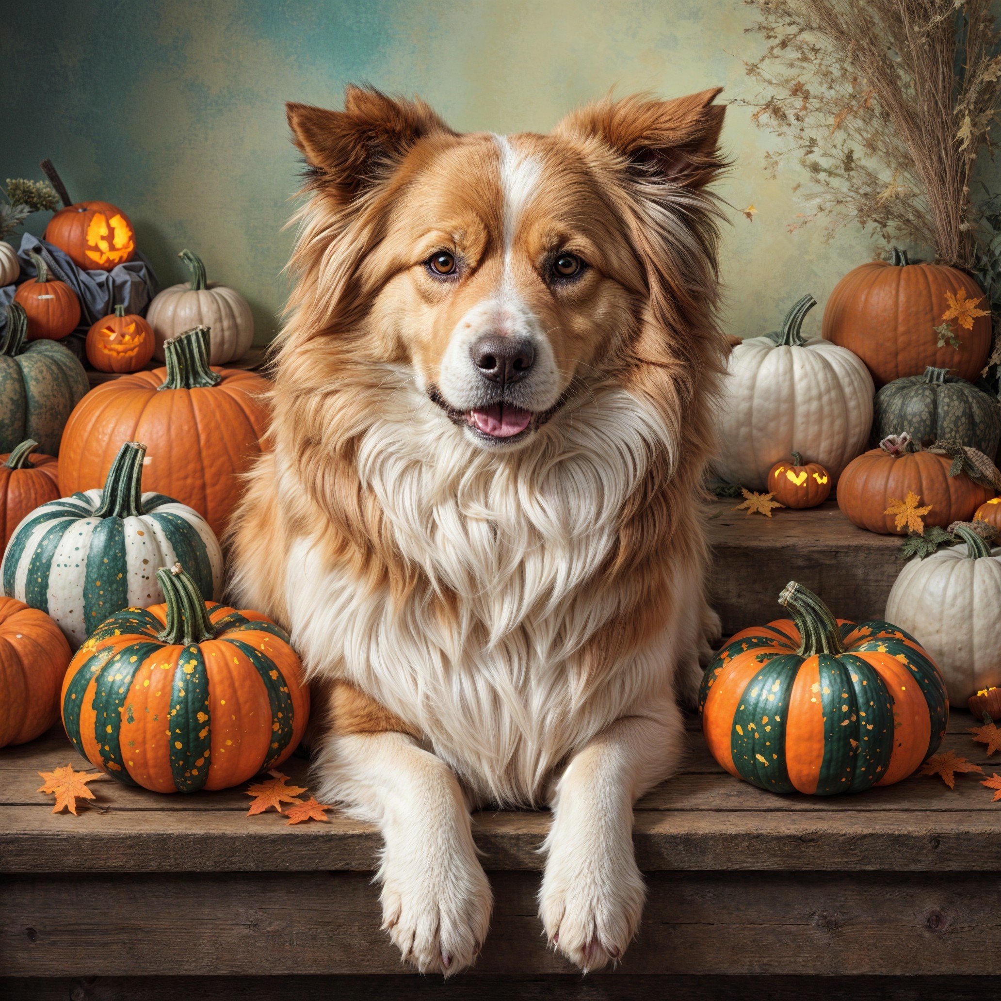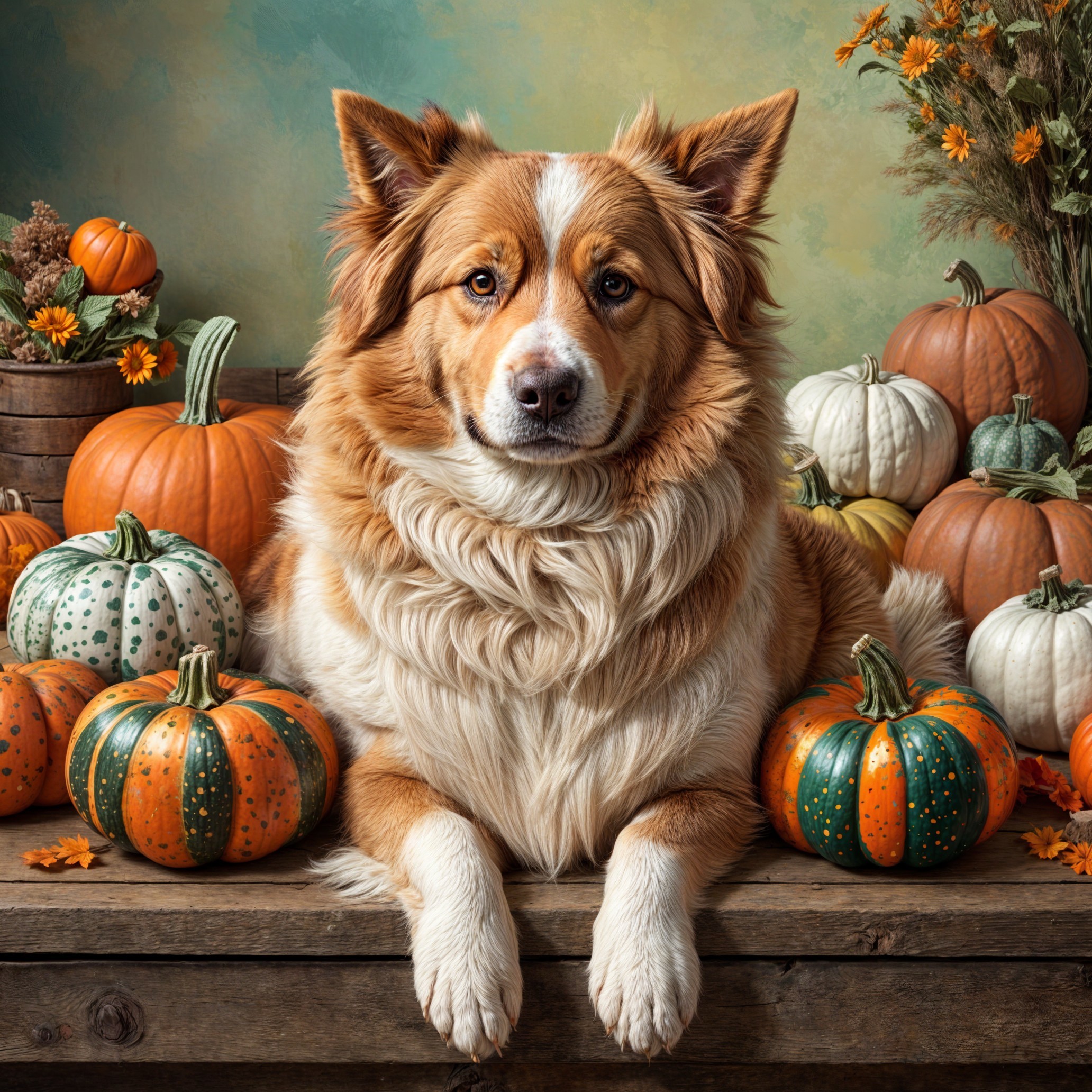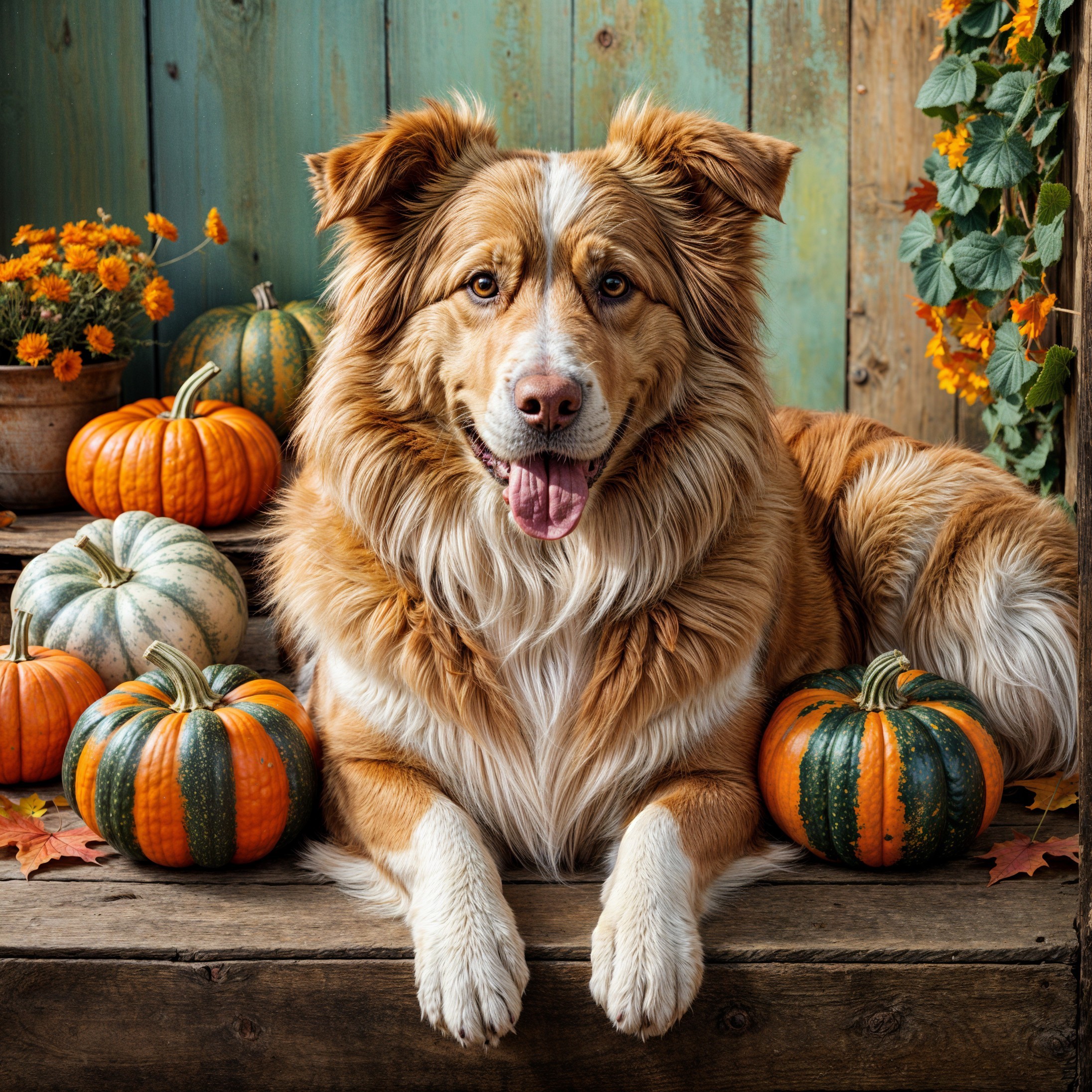 A cheerful dog with a fluffy coat rests on a wooden table surrounded by colorful pumpkins and vibrant flowers, creating a cozy autumn scene.