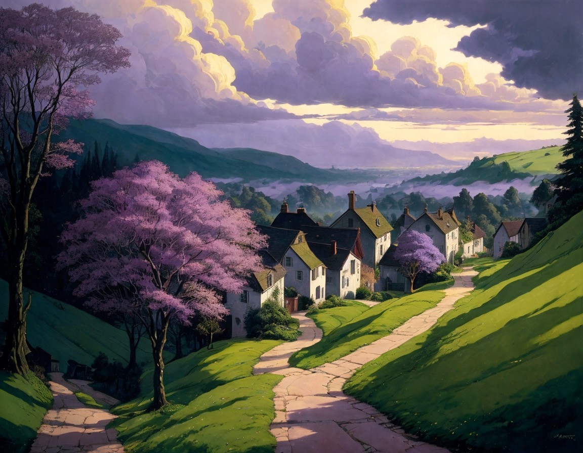 Prompt: "stormy afternoon steep hill winding village lane, looking down, (by Kay Nielsen:0.9), (by Keith Negley:1.4), (style of Ted Nasmith:2.2), sunlight, harmonious muddy color palette, mostly greens and grays and purples and blues, landscape format full width single image"