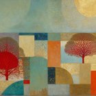A vibrant, abstract landscape featuring colorful trees with red and white foliage against rolling hills. The scene combines blues, oranges, and intricate patterns, creating a harmonious, artistic vision.