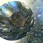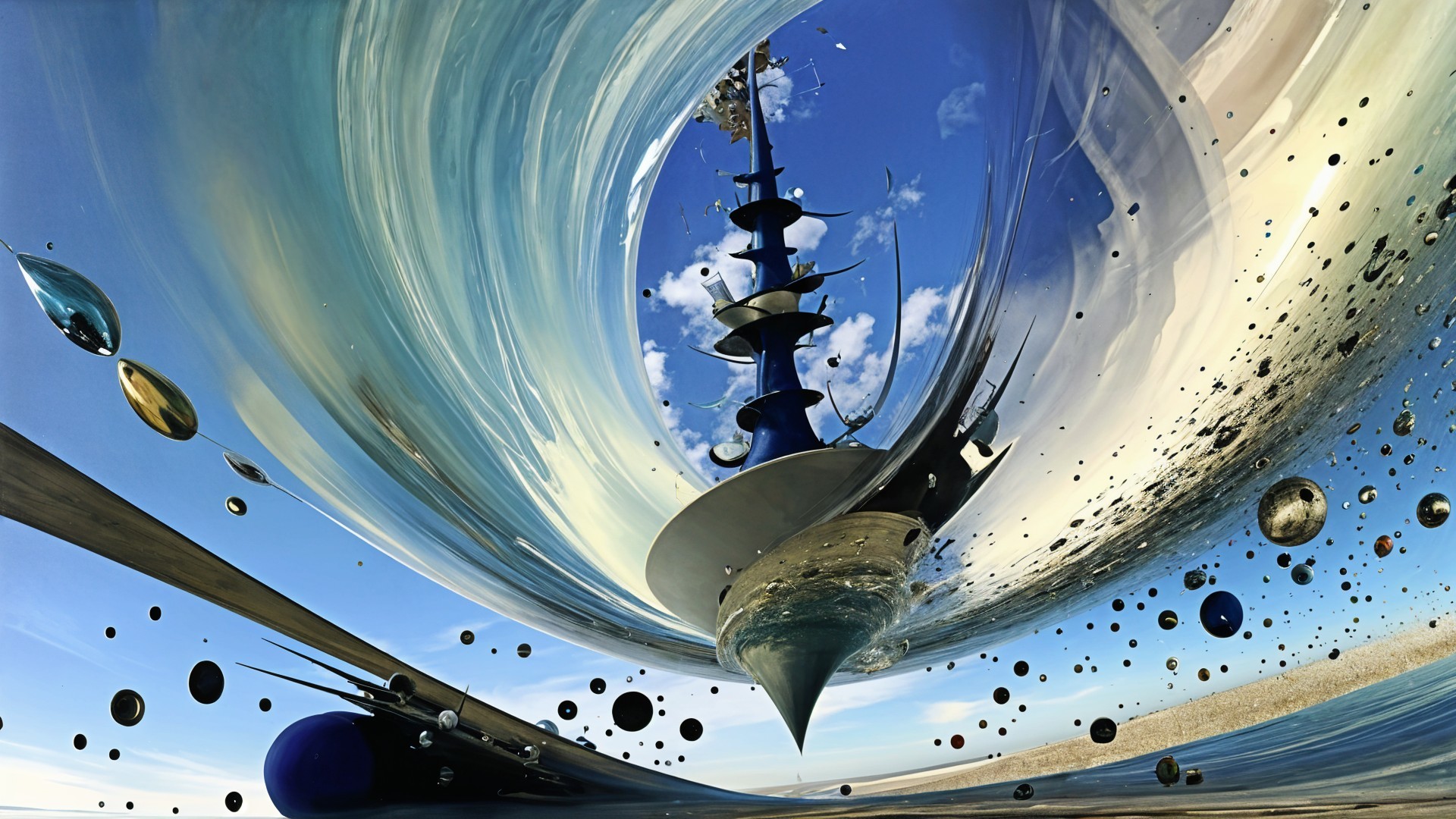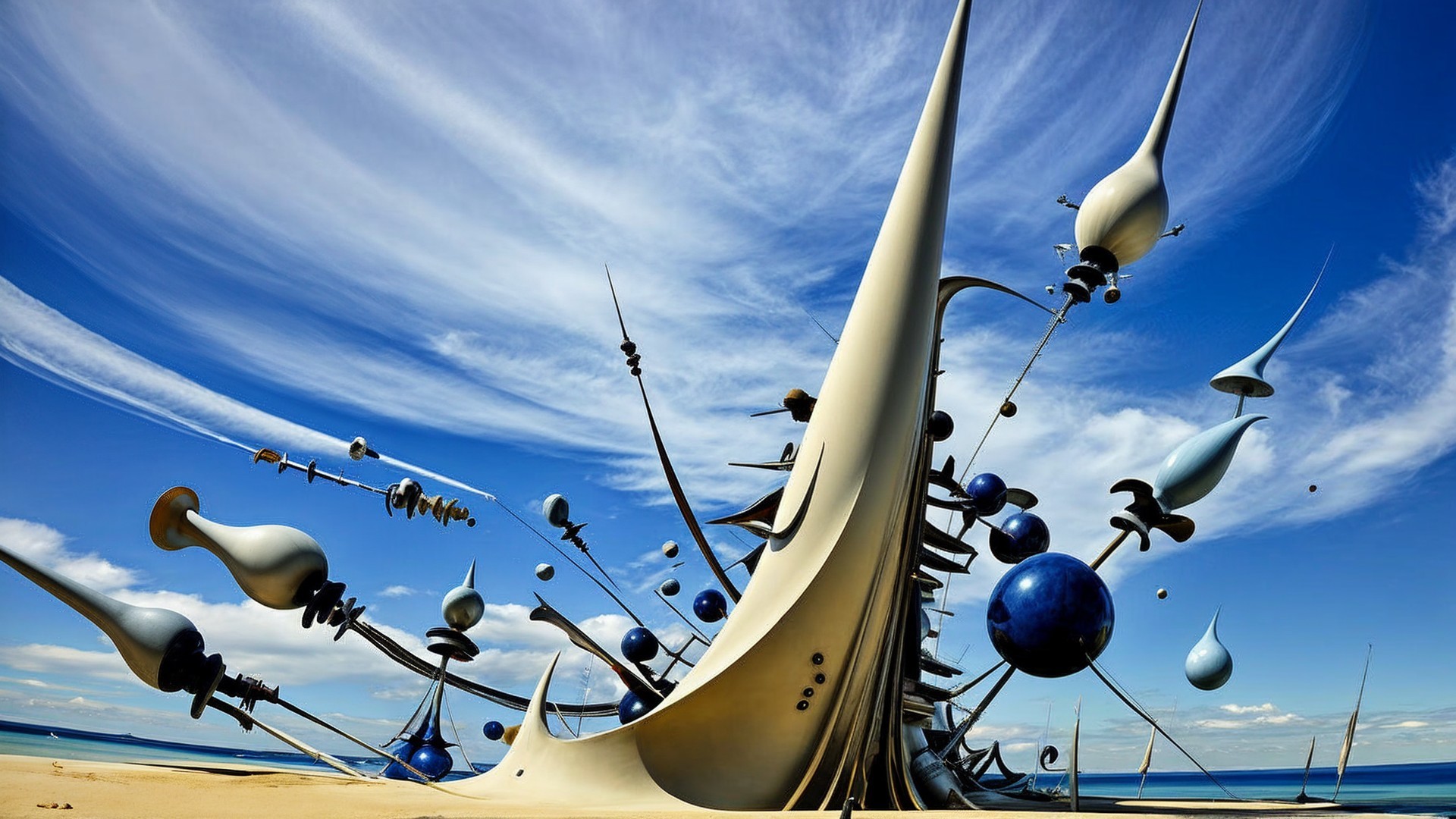 A surreal coastal scene featuring abstract, spiky structures against a vibrant blue sky with wispy clouds. The sandy foreground leads to a serene ocean, creating a fantastical landscape.