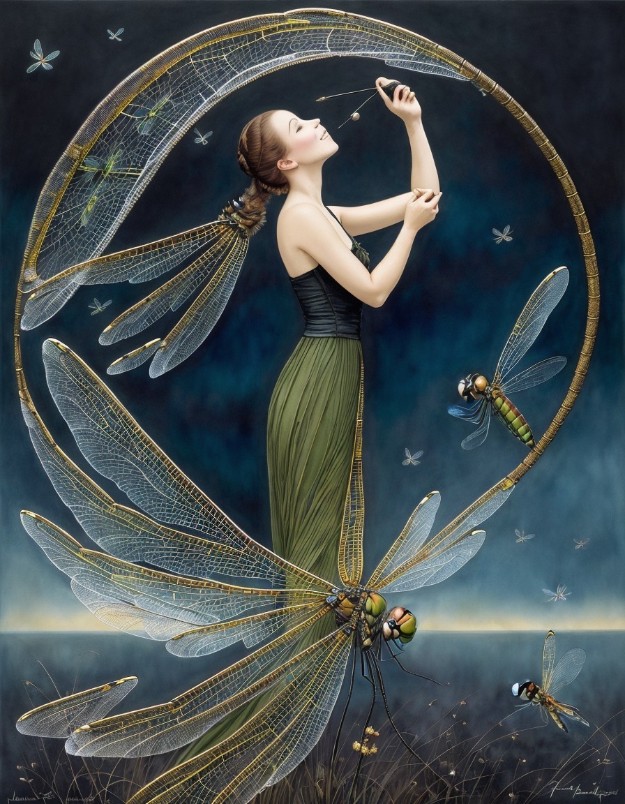A fantasy illustration of a woman interacting with dragonflies, one enlarged beneath her, against a dark backdrop with floral motifs.