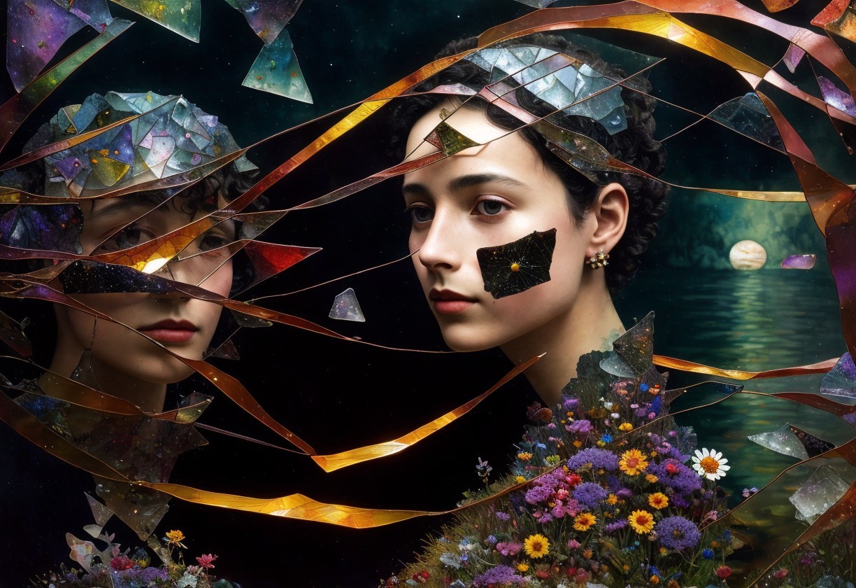 Prompt: lake in mountain woods, highland flower and river spectacular, gravel path, sunset, cosmic night sky ,by Egon Schiele, Paul Klee mixed media, depth of field, parts of background made out of glass shards, metallic ink details and realistic textures created by Dave McKean and Richard Corben