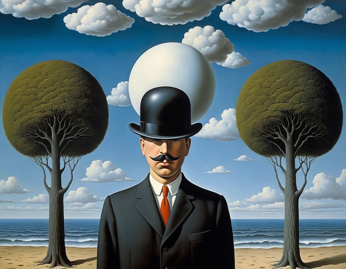 The image features a surreal figure with a cracked mask, painted in a suit against a backdrop of stylized clouds and trees by the seaside, blending themes of identity and isolation.