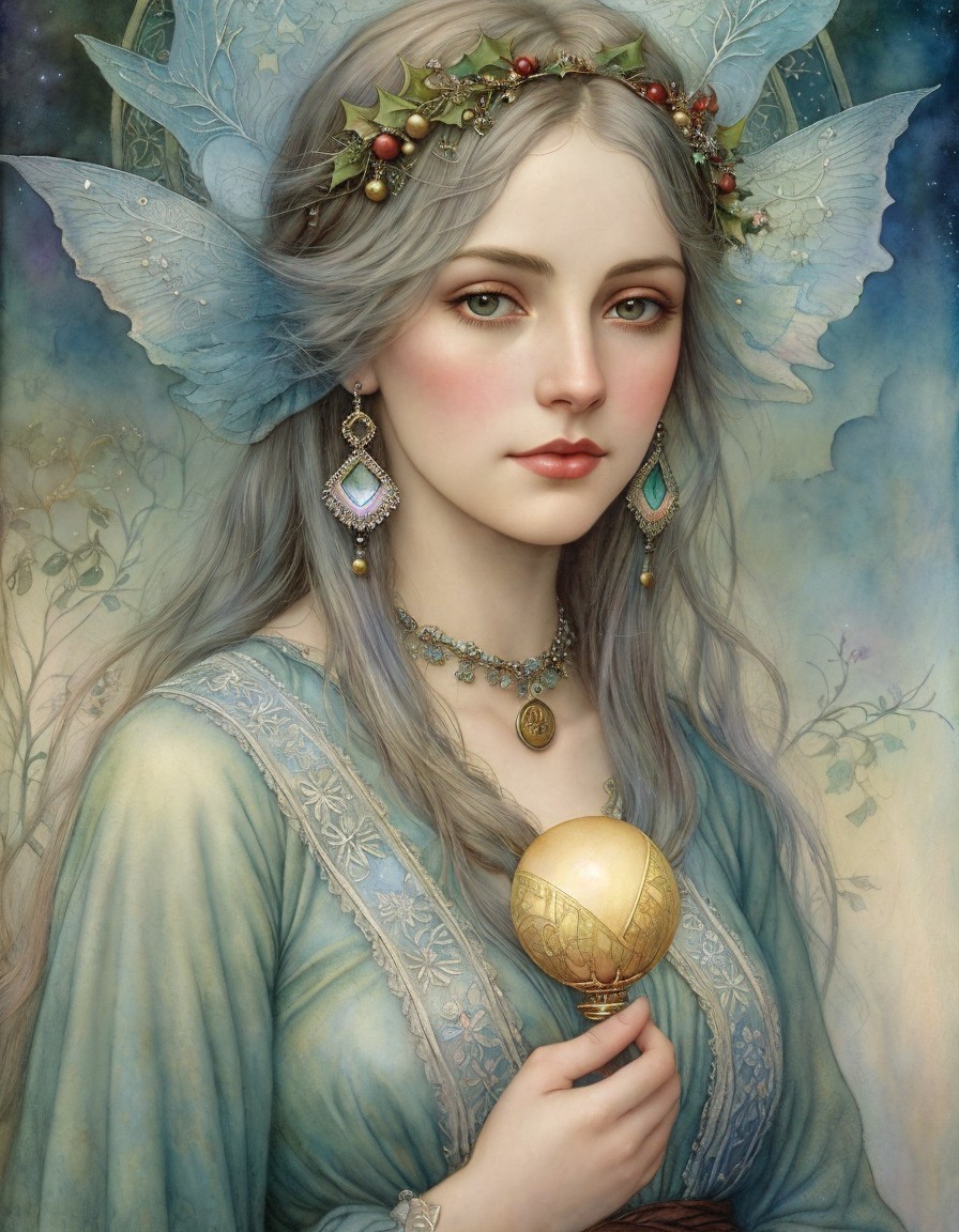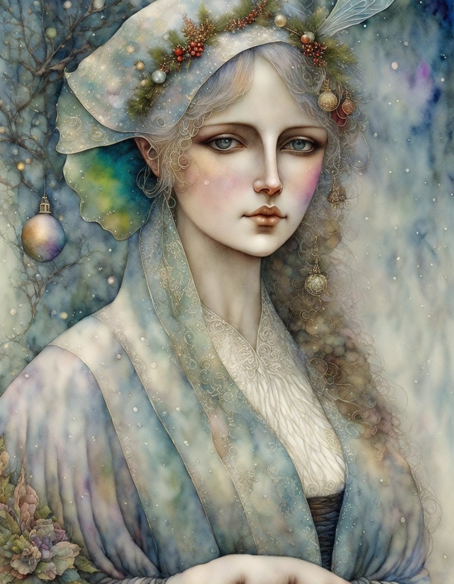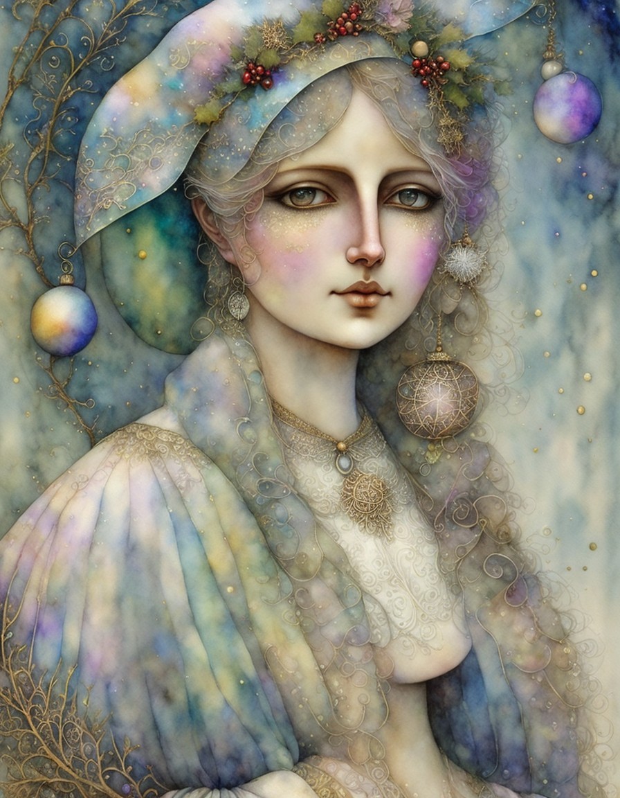 Prompt: Iridescent watercolor and ink By Jamie Heiden, Daniel Merriam, Paul Klee, Karol Bak, Dee Nickerson, extremely detailed, high definition, crisp quality, ultra detailed background art nouveau Christmas maiden