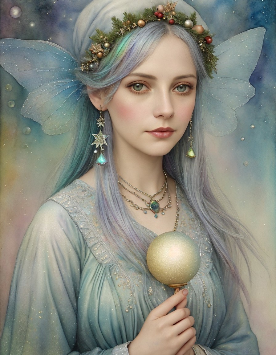 + Prompt:Iridescent watercolor and ink By Jamie Heiden, Daniel Merriam, Paul Klee, Karol Bak, Dee Nickerson, extremely detailed, high definition, crisp quality, ultra detailed background medieval Christmas fairy