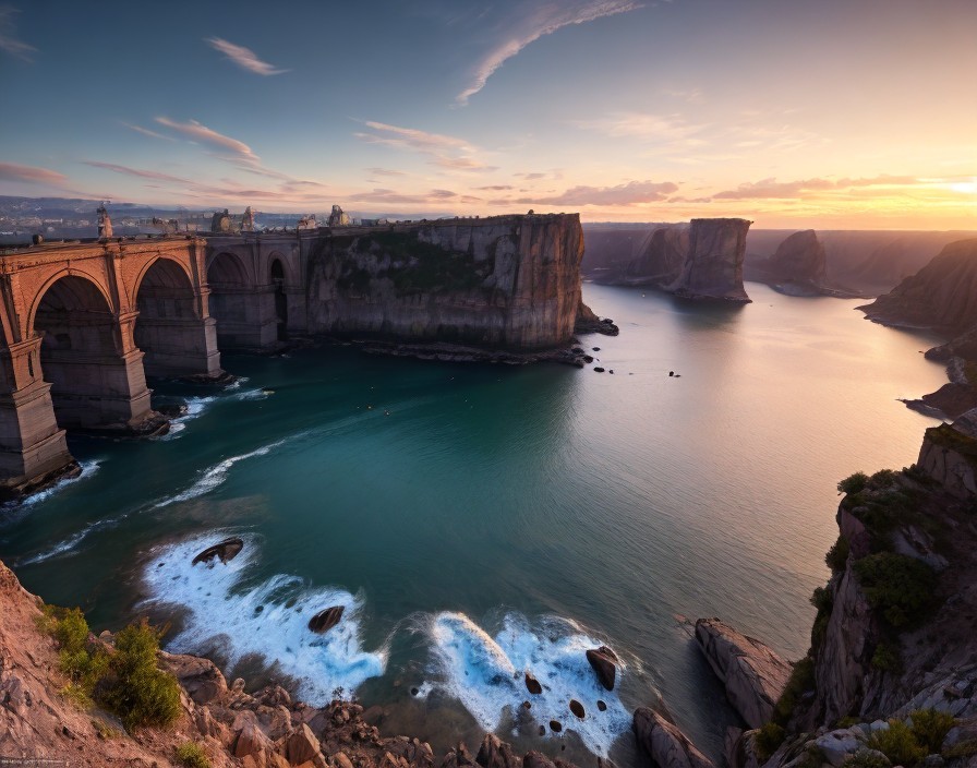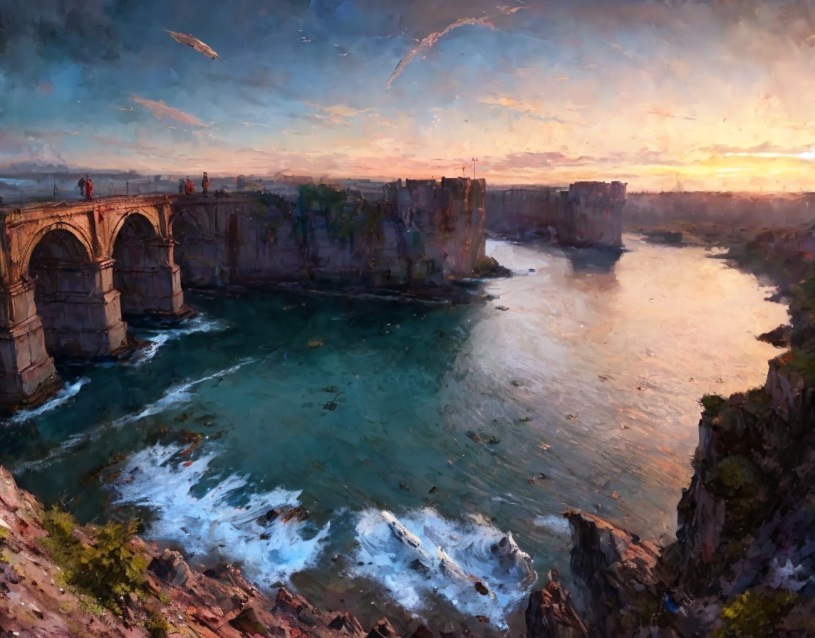 A breathtaking landscape features towering cliffs beside a serene river, with a majestic arched bridge in the foreground. The scene is bathed in warm sunset hues, evoking a sense of tranquility.