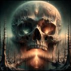 Colossal Skull in Surreal Landscape with Glowing Orb