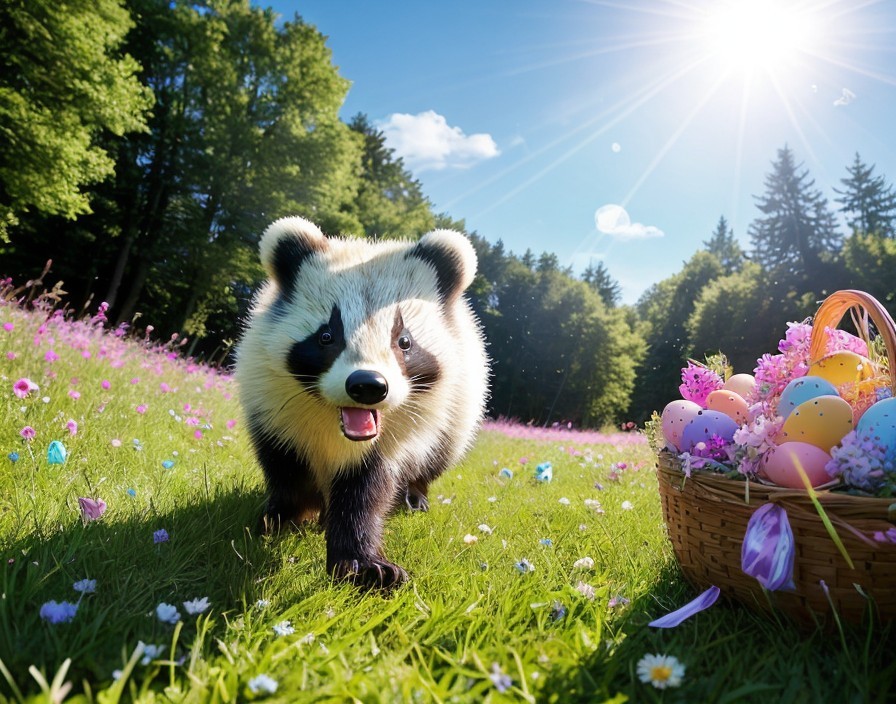 151515·Photograph capturing a playful moment a fluffy Badger runs through the meadow with a basket of colorful Easter eggs, against a backdrop of blooming flowers, lens flare effects reminiscent of Annie Leibovitz's style, vibrant colors, hyperrealistic details, 8k resolution.[blending Junji Ito's horror with Robert Oxley's mastery, Gazelli's uncanny touch, and M.W. Kaluta's surrealism. Featuring mixed brush strokes, paint splatter, and drip painting, creating a masterpiece in 8k resolution, trending on ArtStation]{The high-resolution, photorealistic quality captured with a Nikon Z9 and 85mm F1.2 lens enhances the intricate details and hues of the composition}