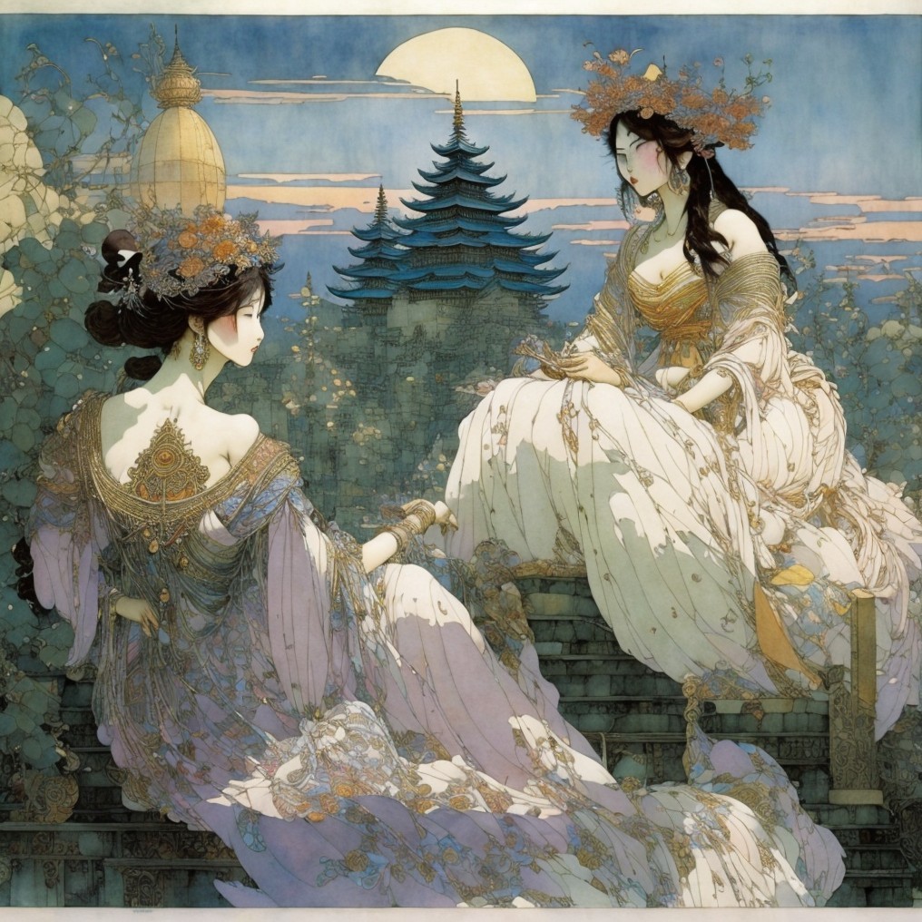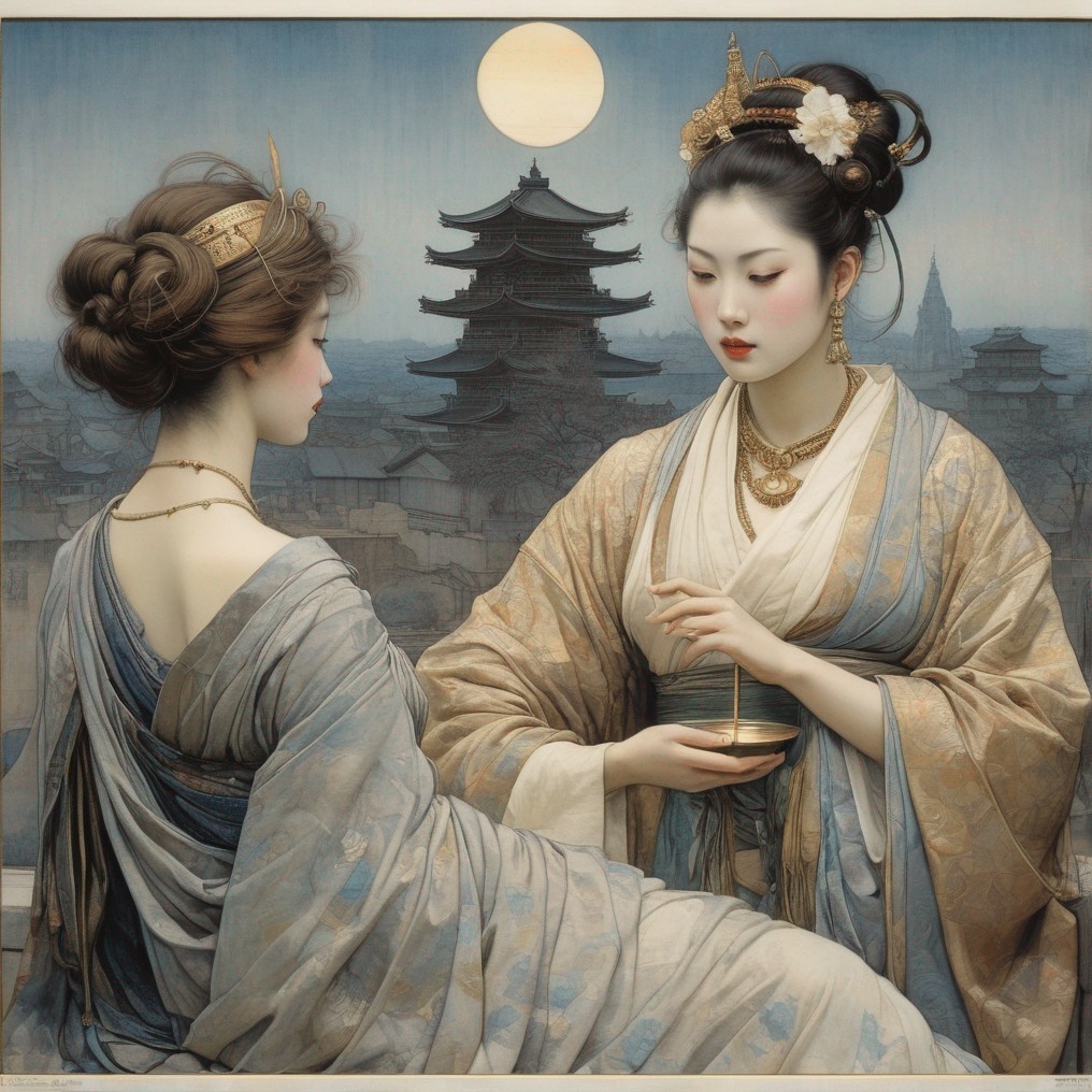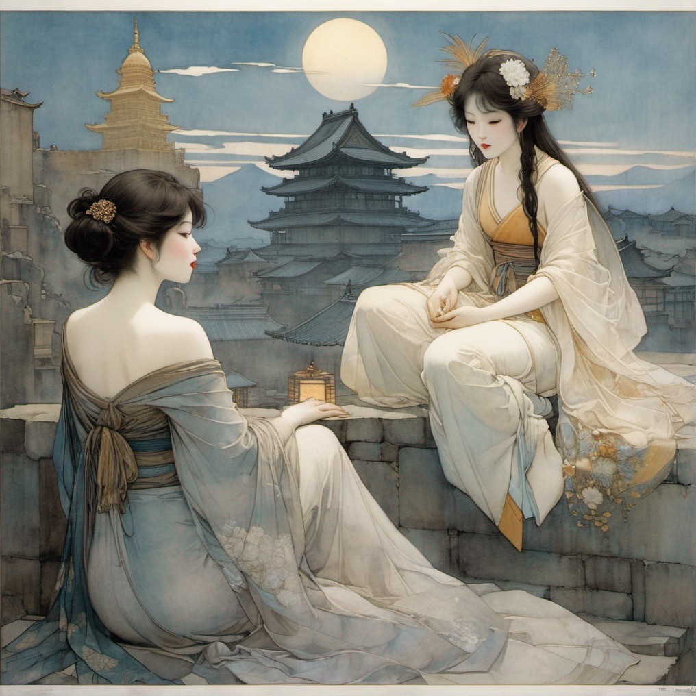 A woman in traditional attire holds a burning incense bowl before an ancient Asian palace under a full moon.