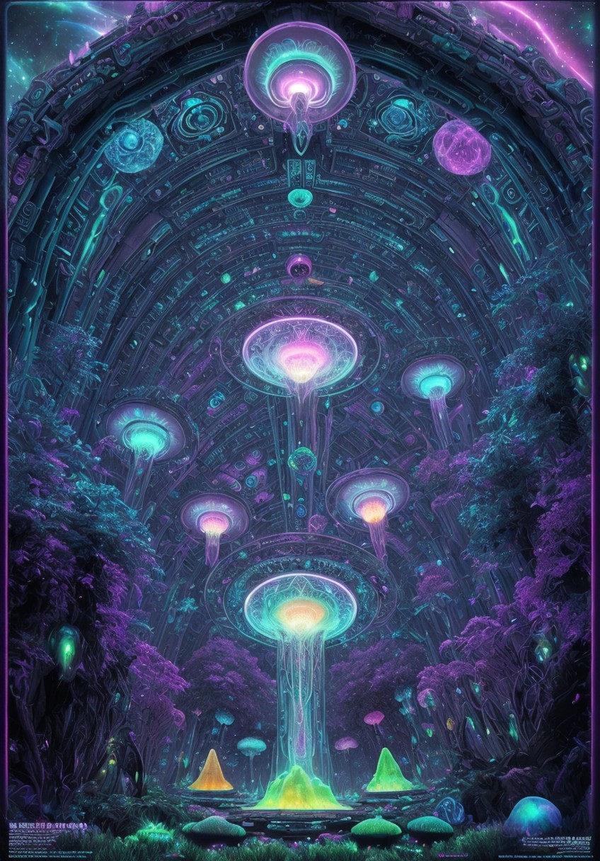 A mystical neon forest with a giant glowing tree under an intricate alien dome emitting a central beam of light.