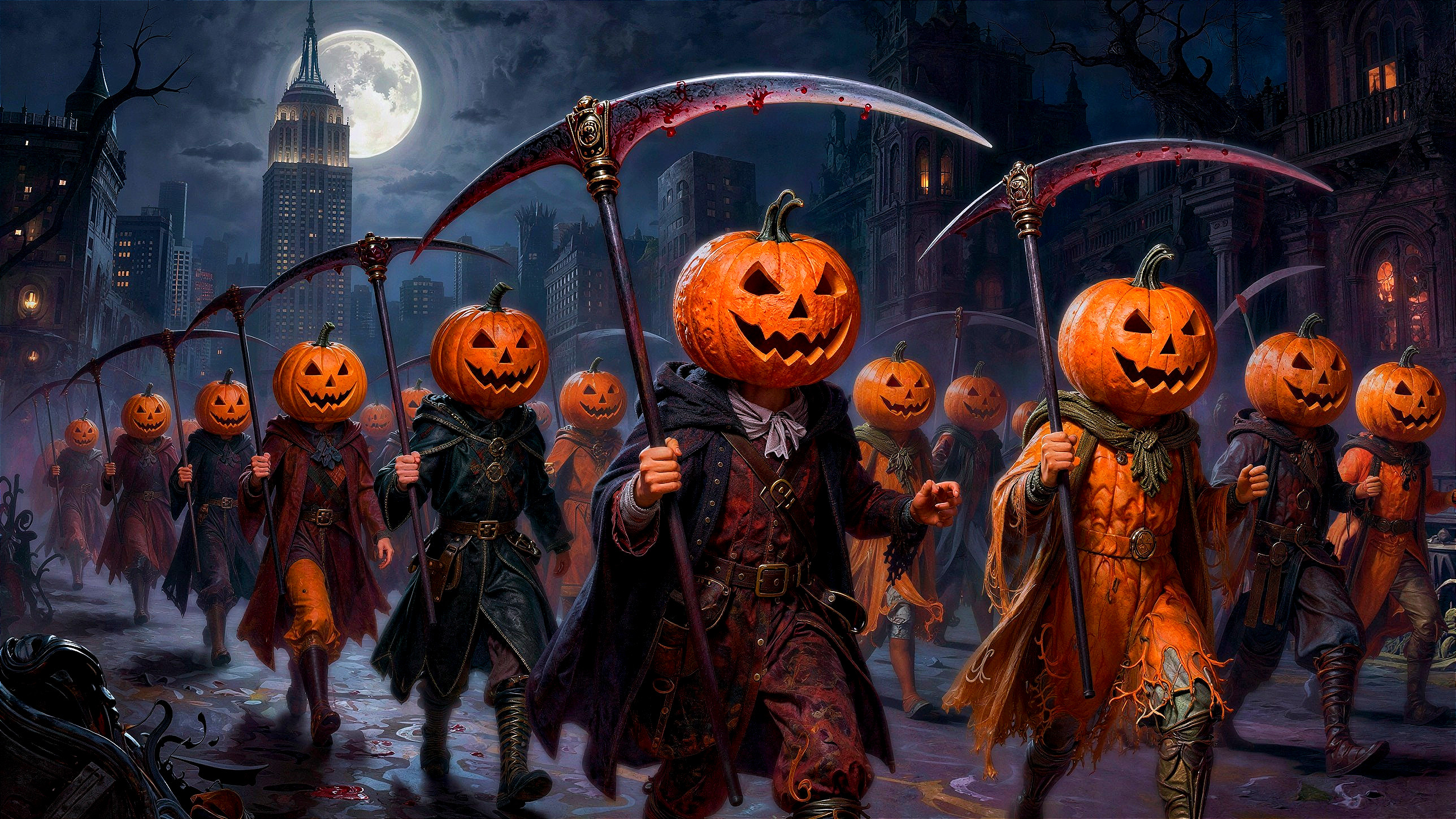 A high-angle digital painting of a crowd of pumpkin-headed scarecrows wearing weathered cloaks marching down an old, European-style city street at night under a full moon, with the Empire State Building in the background. The pumpkin heads glow with light from their carved faces, which have triangular