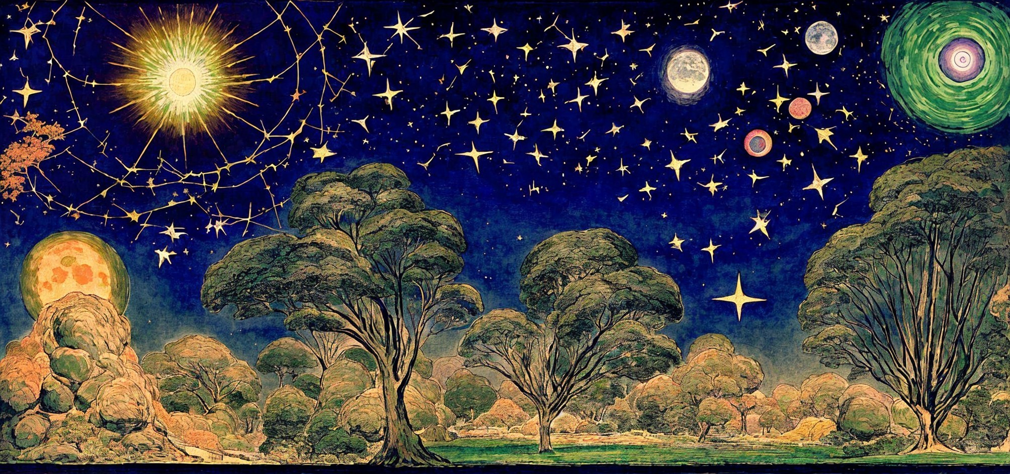 + Prompt:Create a night scene. A lue-black sky full of stars, a green moon, a comet, Style Williem Blake. Animated trees moved by the night wind, bushes in which a jaguar hides. You can see its flashing eyes