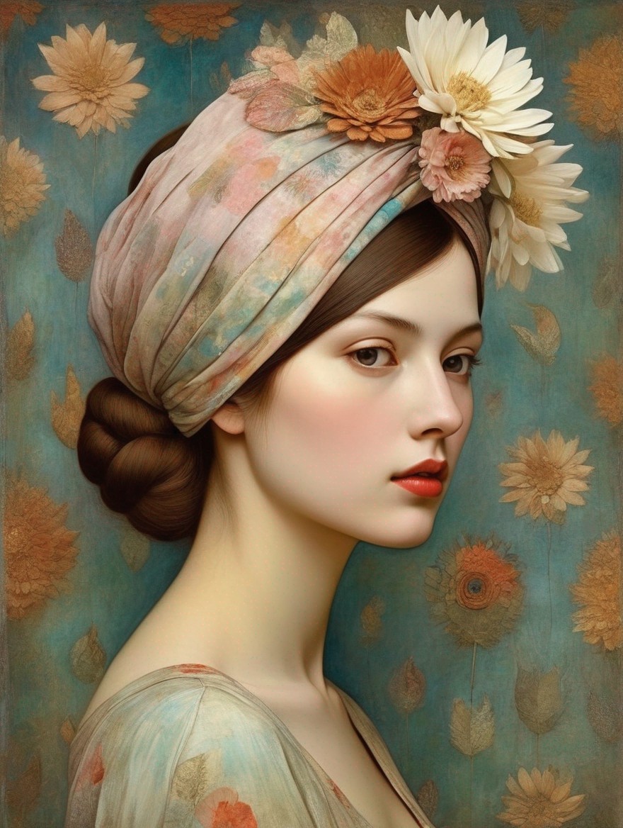Portrait of a woman with a floral headwrap and vintage style, against a flower-patterned backdrop.