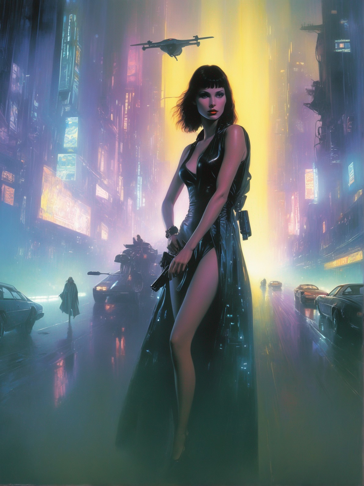 A stylized woman in a futuristic cityscape with neon signs, flying vehicle overhead, and atmospheric lighting.